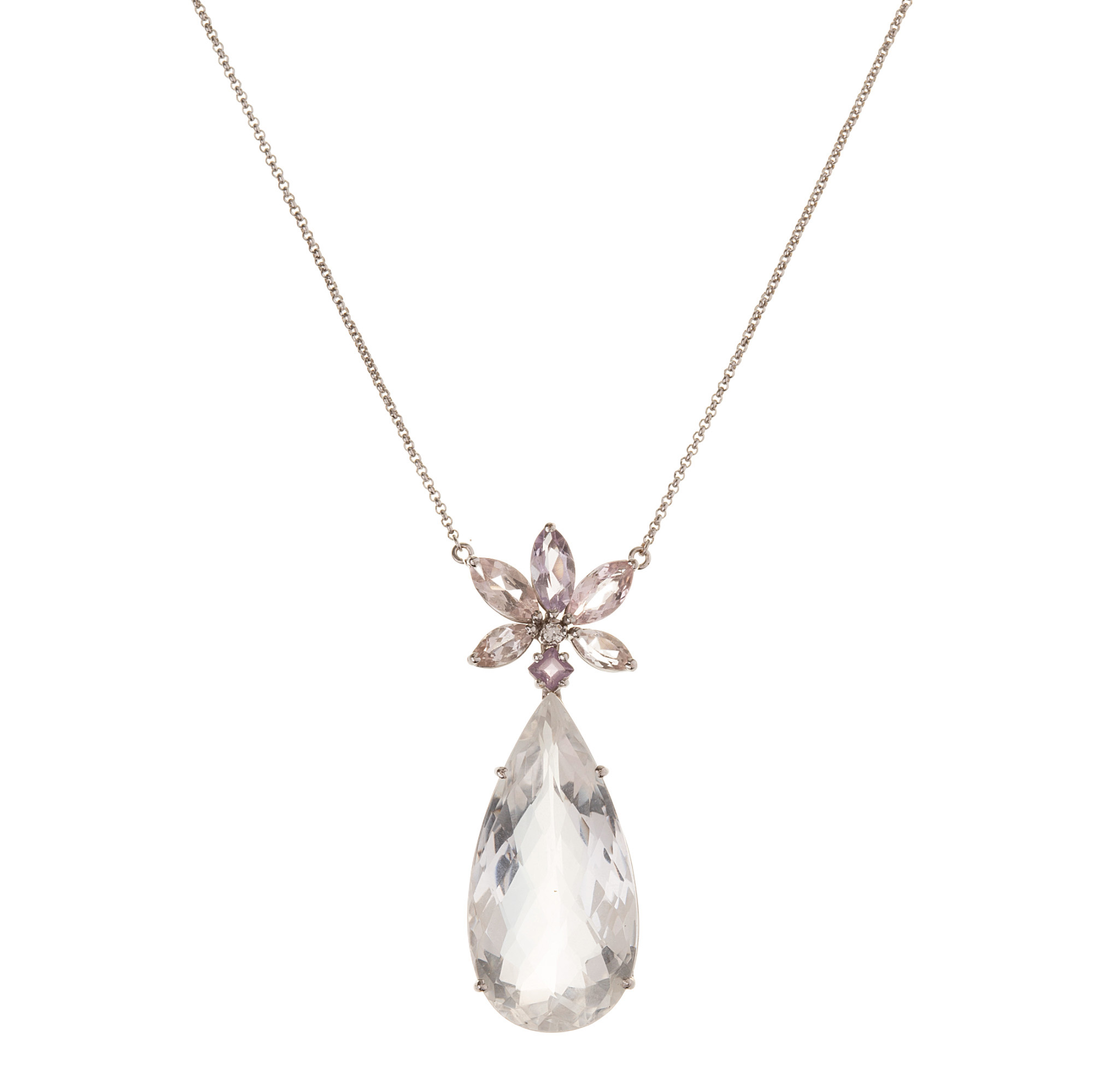 Corrente com pingente de ouro branco, ametistas, quartzos, 0,04ct de brilhante e 10,0g. Medidas 4,3cm/41cm.