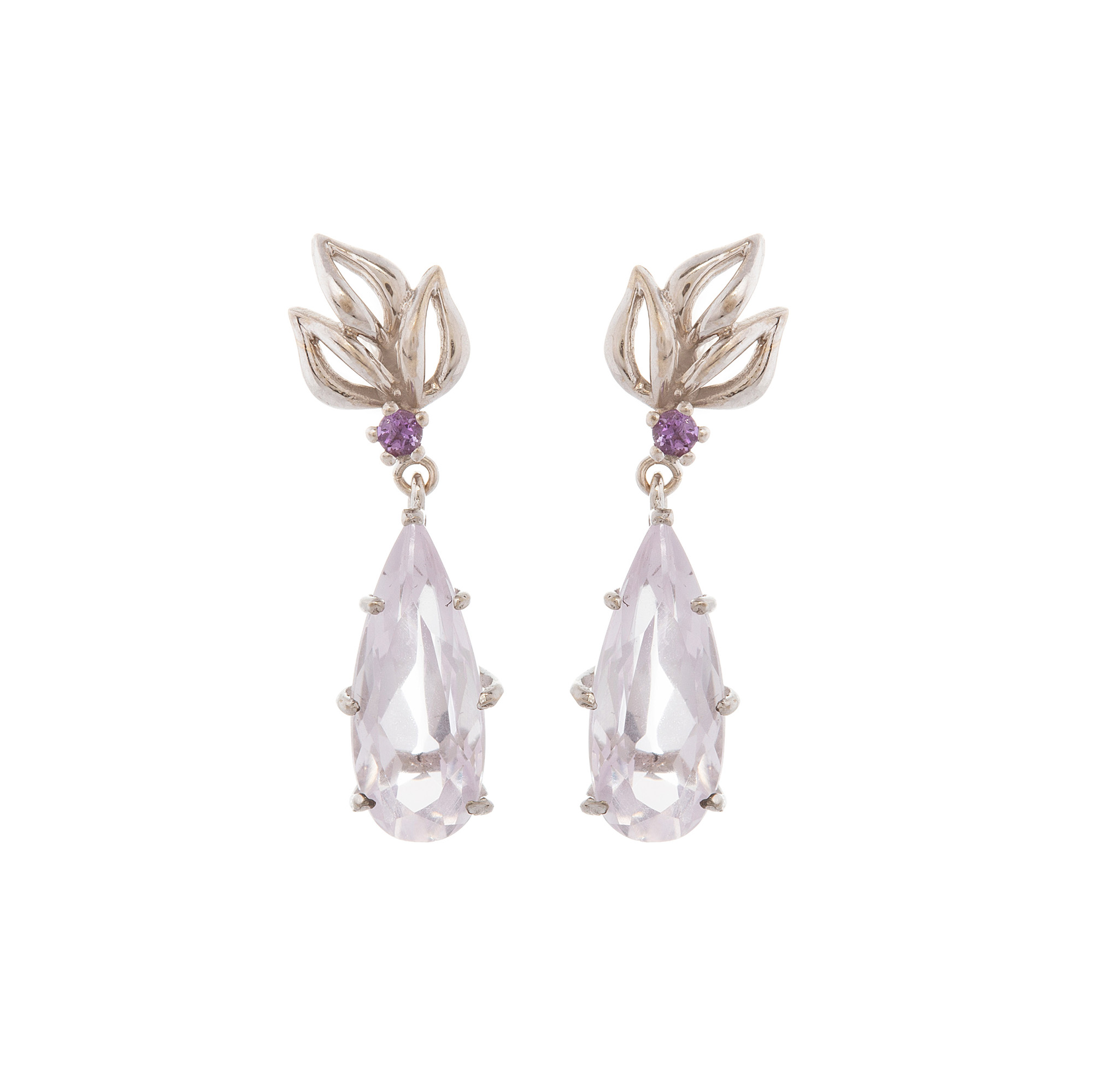 Brinco de ouro branco com ametistas e quartzos. Medida 2,7cm.