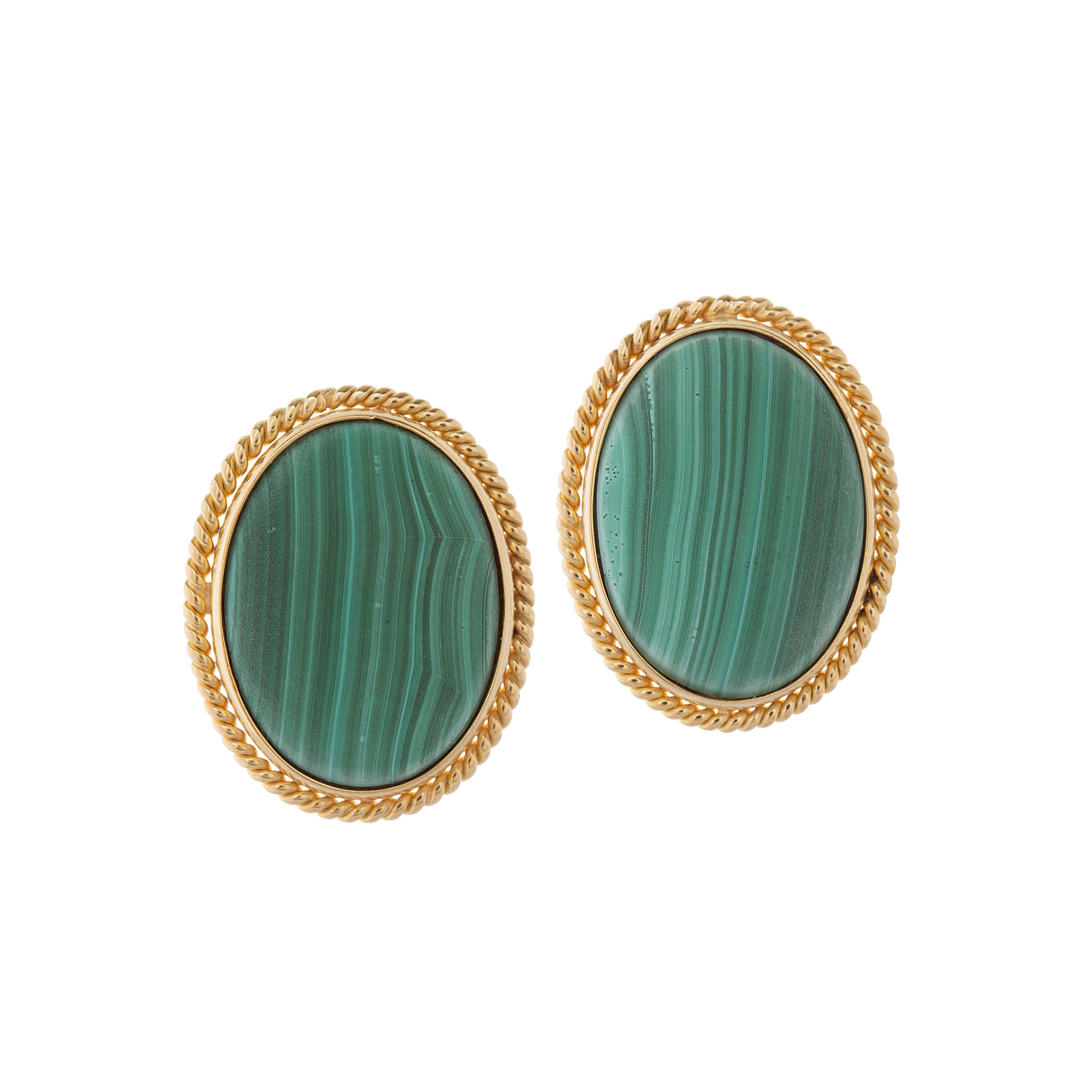 Brinco de ouro amarelo com malaquitas e 10,6g. Medida 2,2cm.