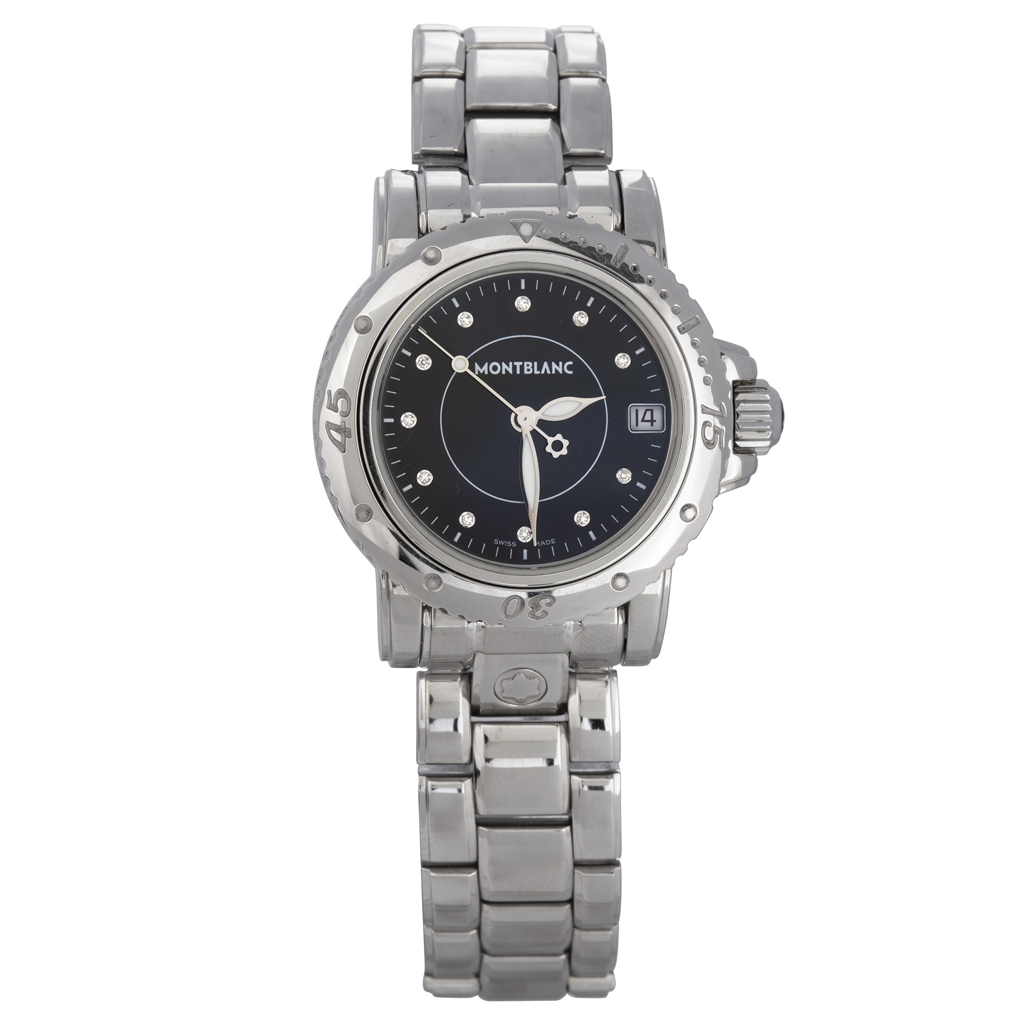 . Relógio Meisterstuck de aço com 0,06ct de brilhantes, movimento a quartzo, calendário, vidro de safira, anos 2000. Caixa 34mm. Pulseira 16cm.