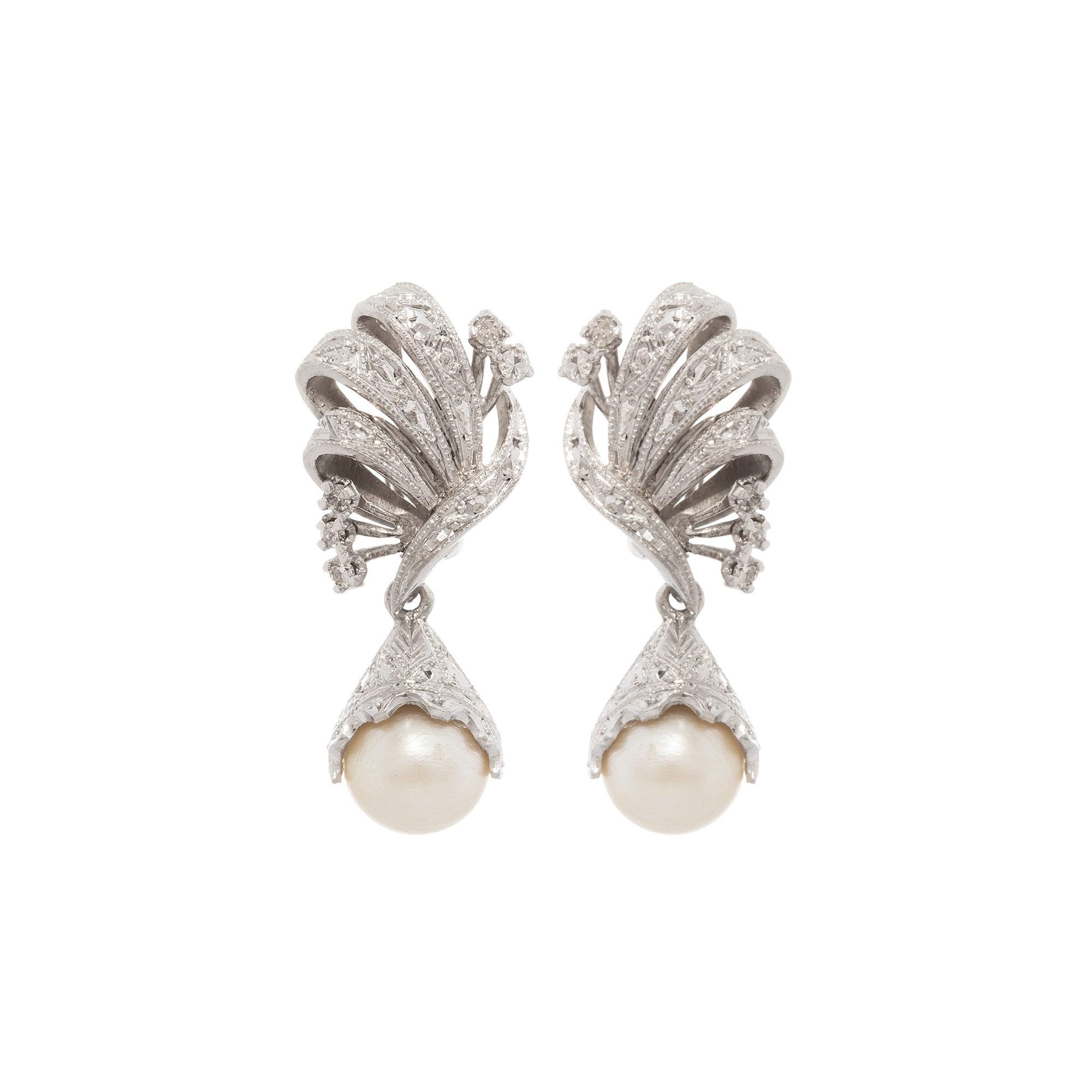 Brinco de ouro branco com pérolas (7,8mm), 0,20ct de brilhantes e 8,7g. Medida 3cm.