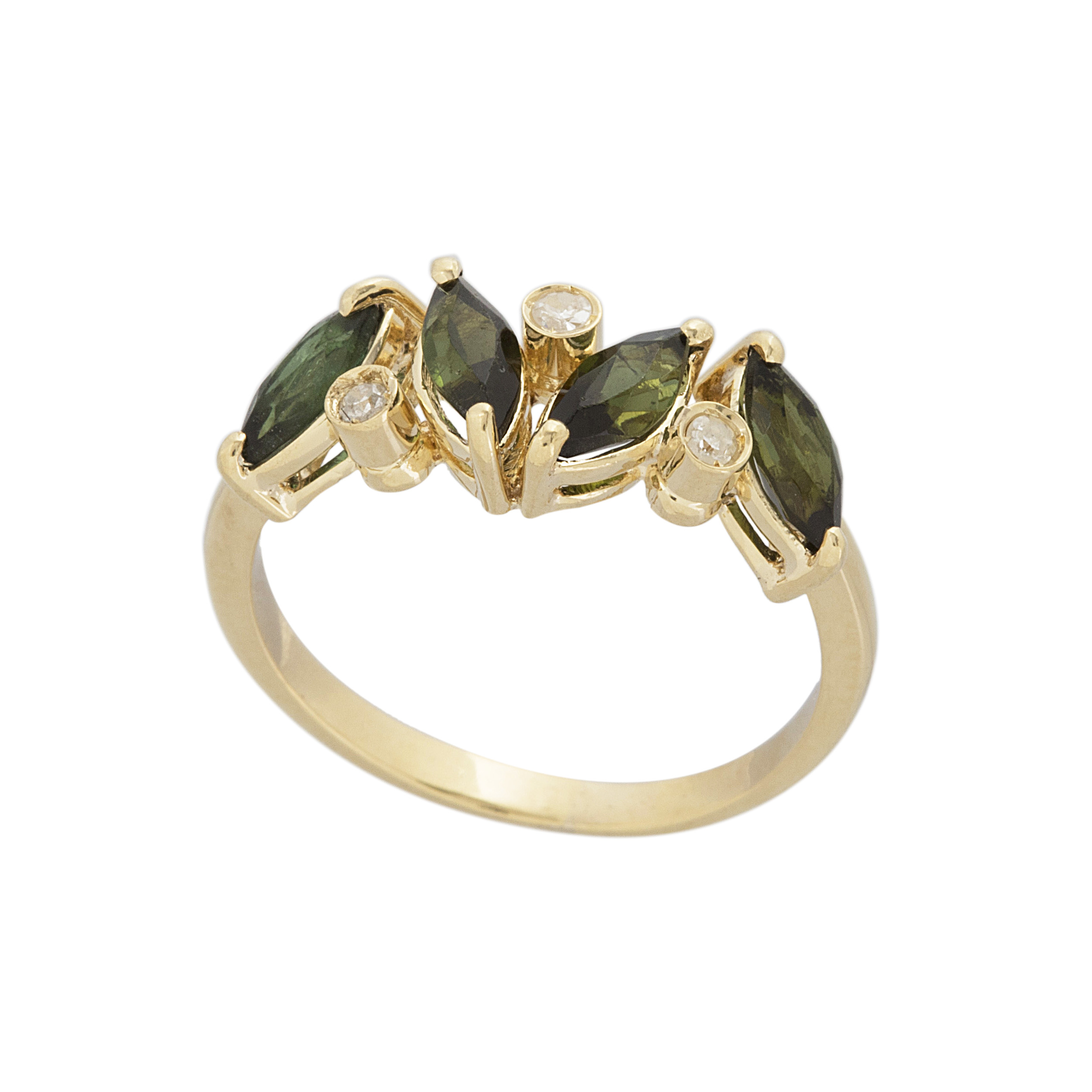 Meia-aliança de ouro amarelo com 1,07ct de turmalinas verdes, 0,05ct de brilhantes e 3,0g. Medida 15.