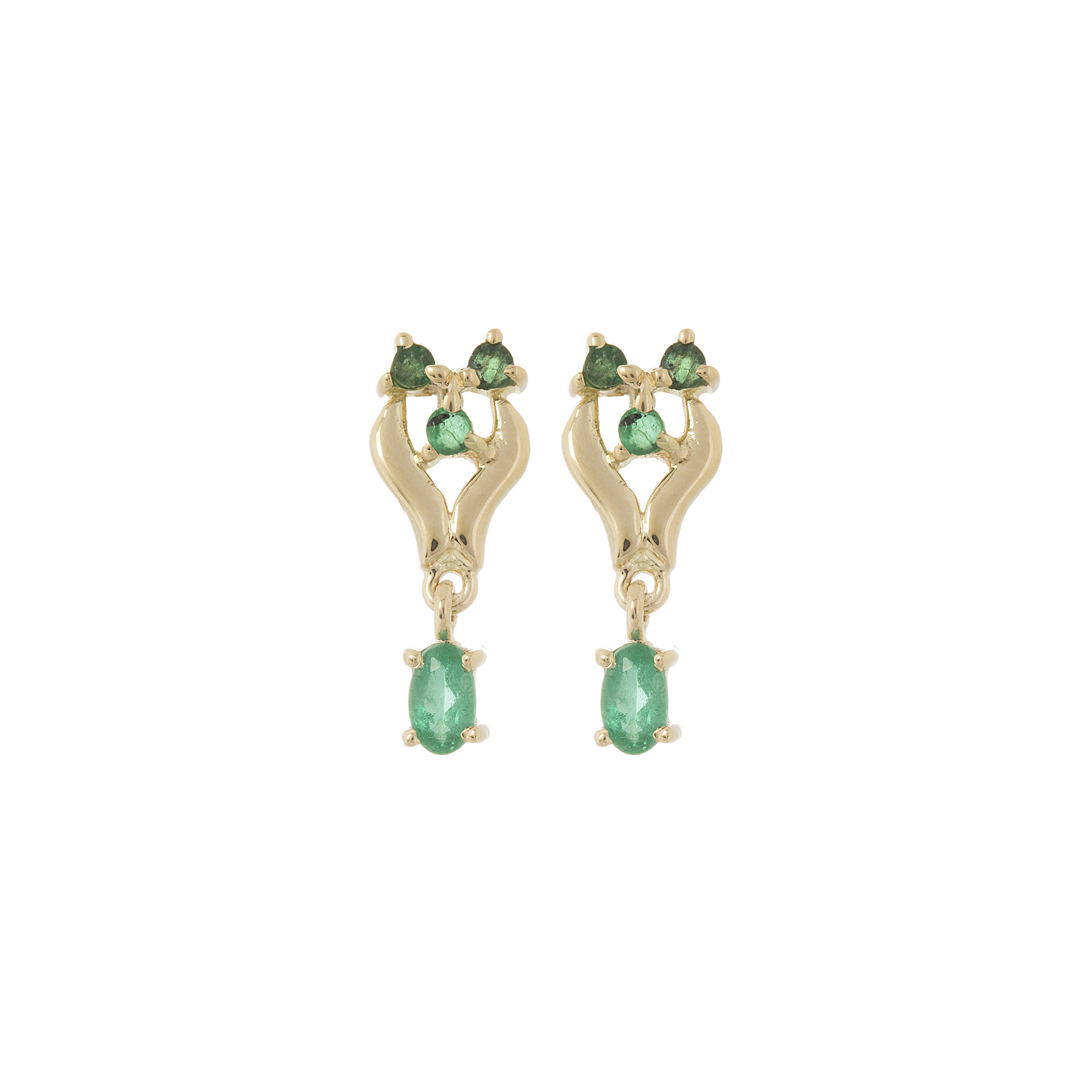 Brinco de ouro amarelo com 0,19ct de esmeraldas e 2,4g. Medida 1,8cm.