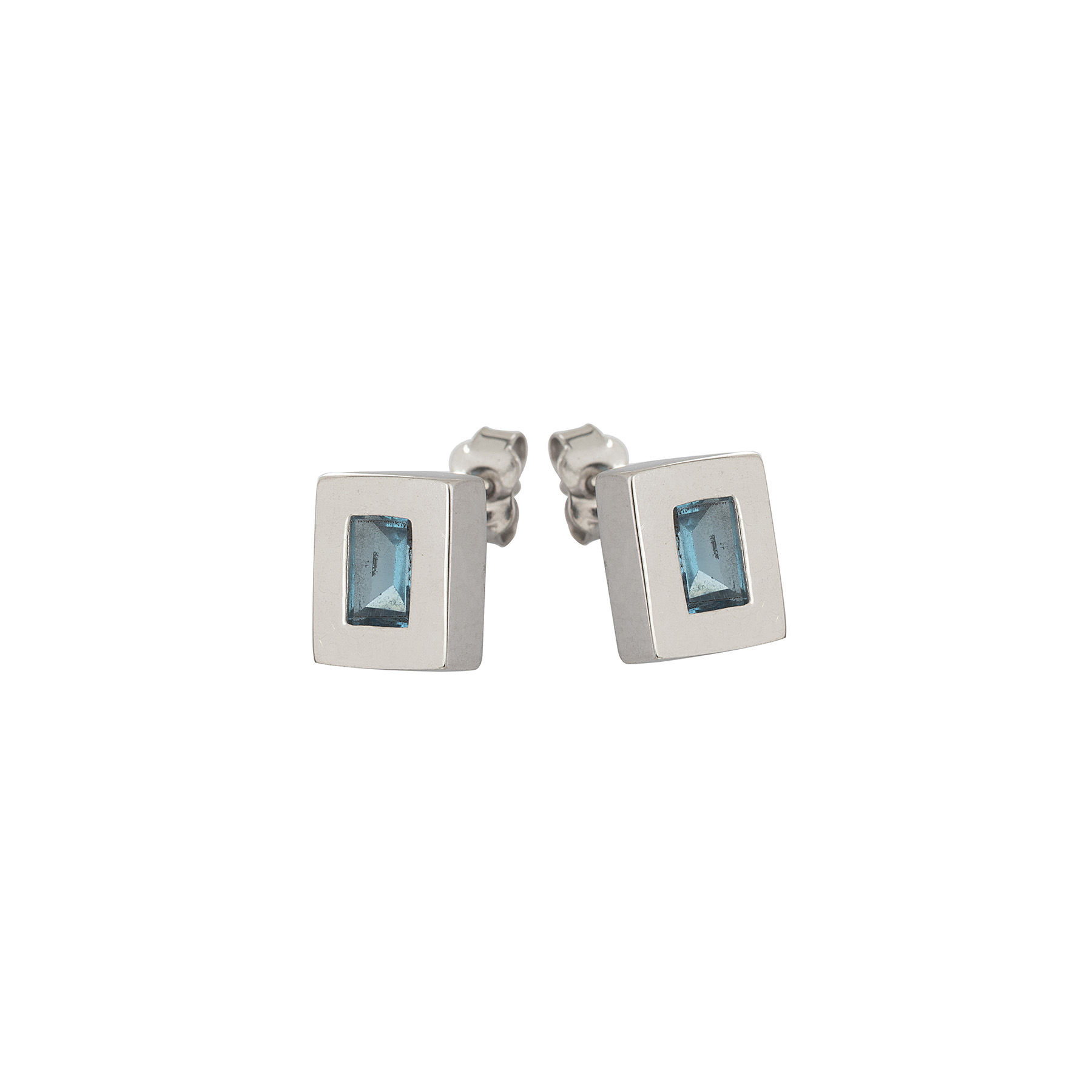 Brinco de ouro branco com topázios azuis e 3,2g. Medida 0,8cm.