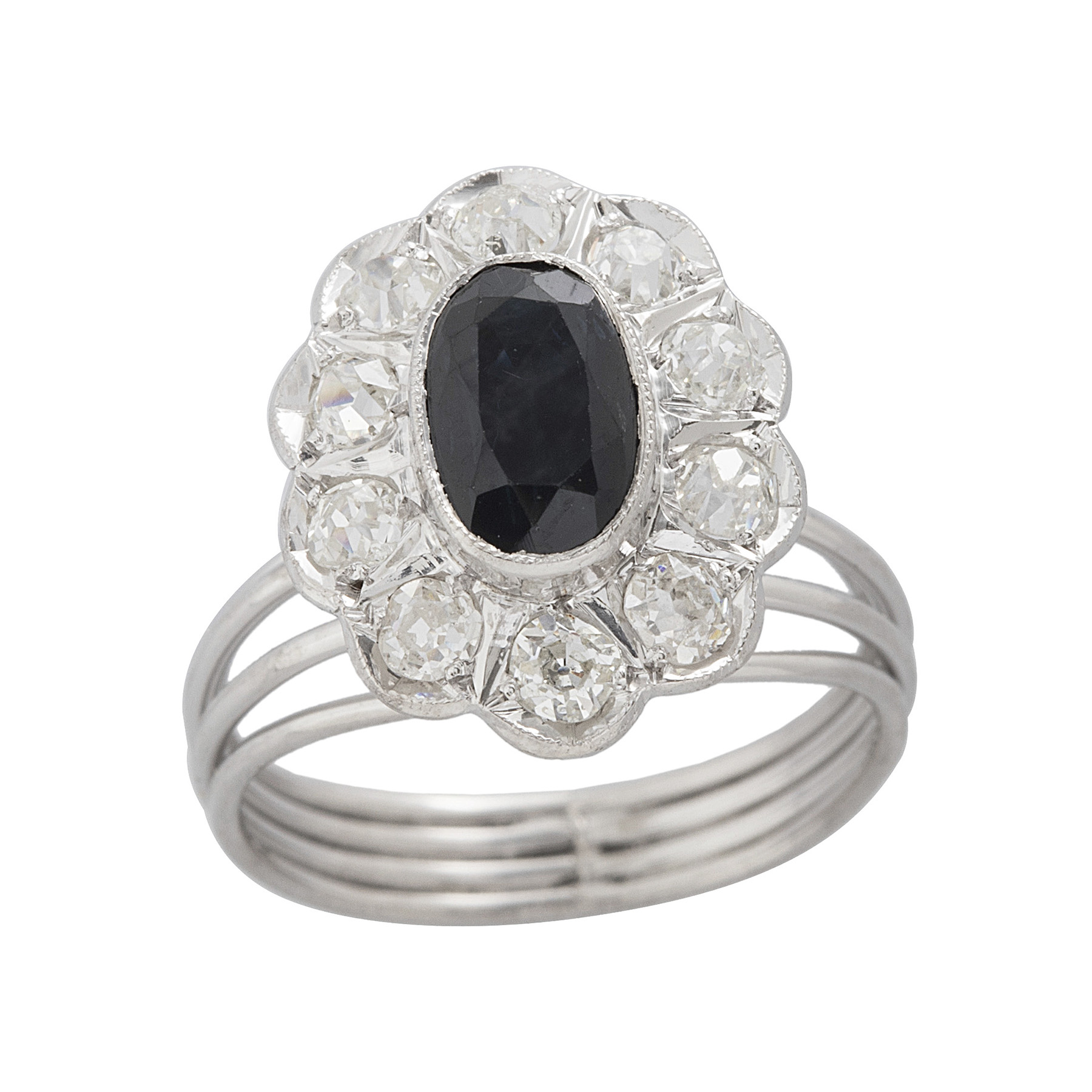 Anel de ouro branco com safira, 0,80ct de brilhantes e 4,2g. Medida 14.