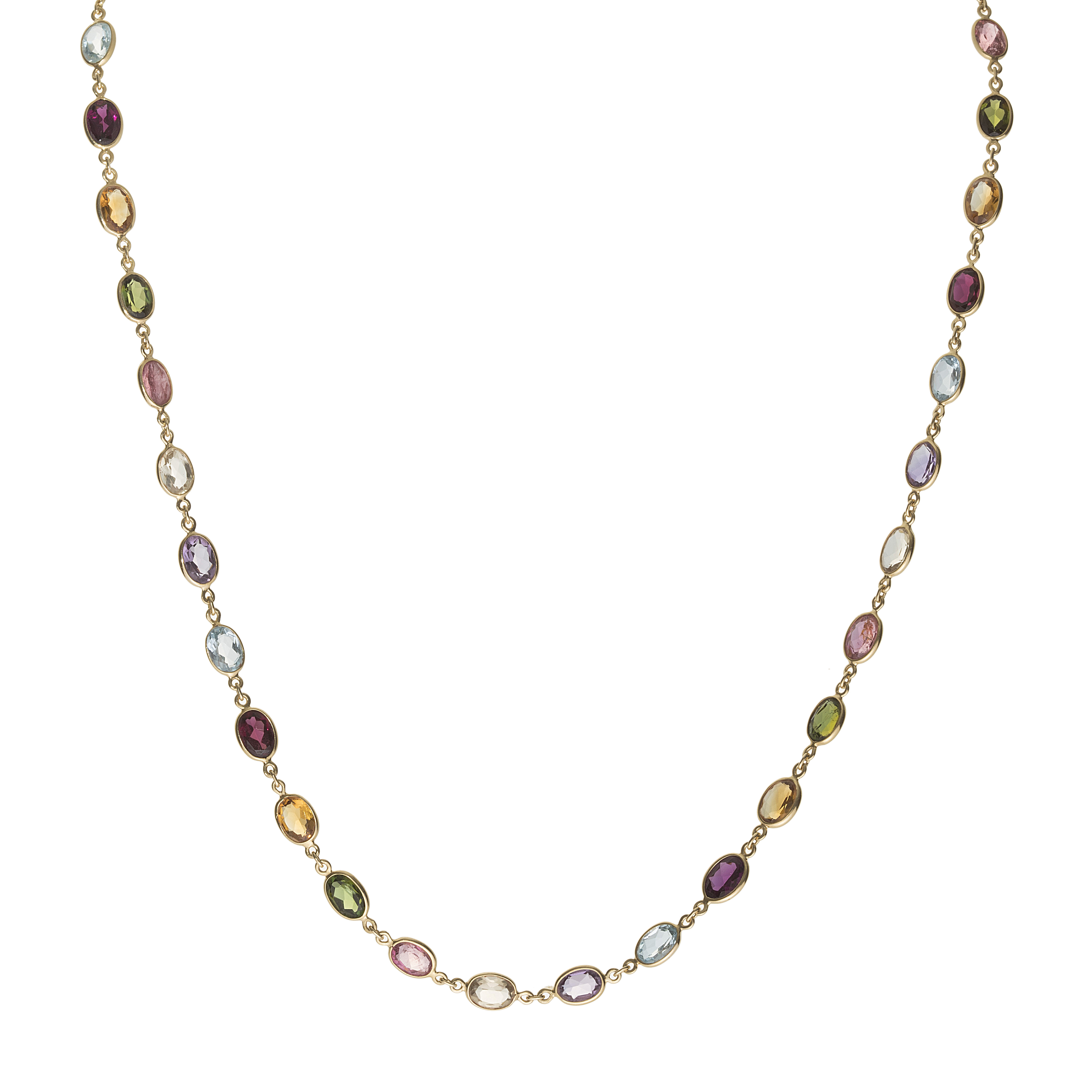 Gargantilha de ouro amarelo com turmalinas verdes e rosa, topázios azuis, ametistas, citrinos, rodolita, quartzo fumê e 12,6g. Medida 50cm.