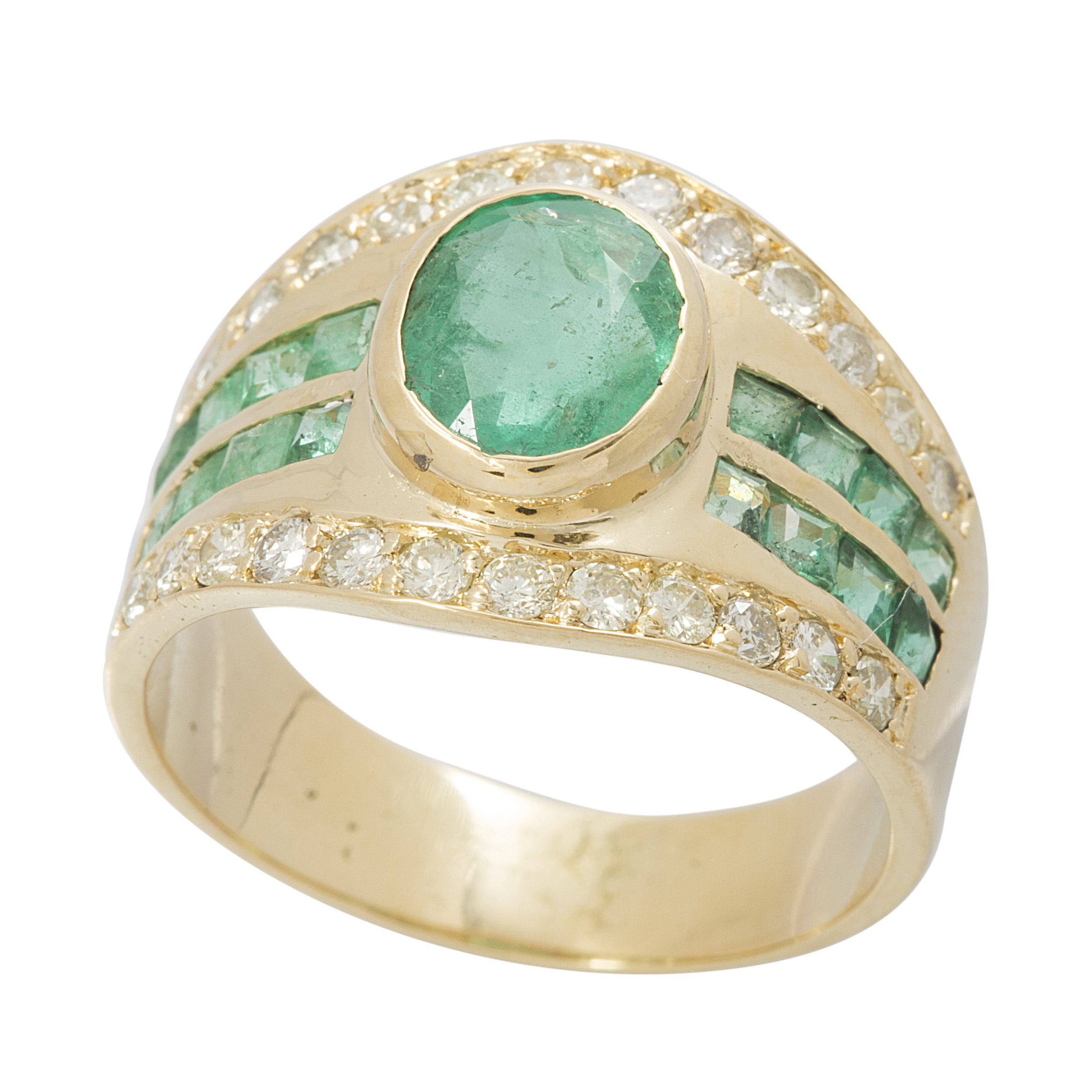 Anel de ouro amarelo com esmeraldas, 0,80ct de brilhantes e 5,8g. Medida 15.