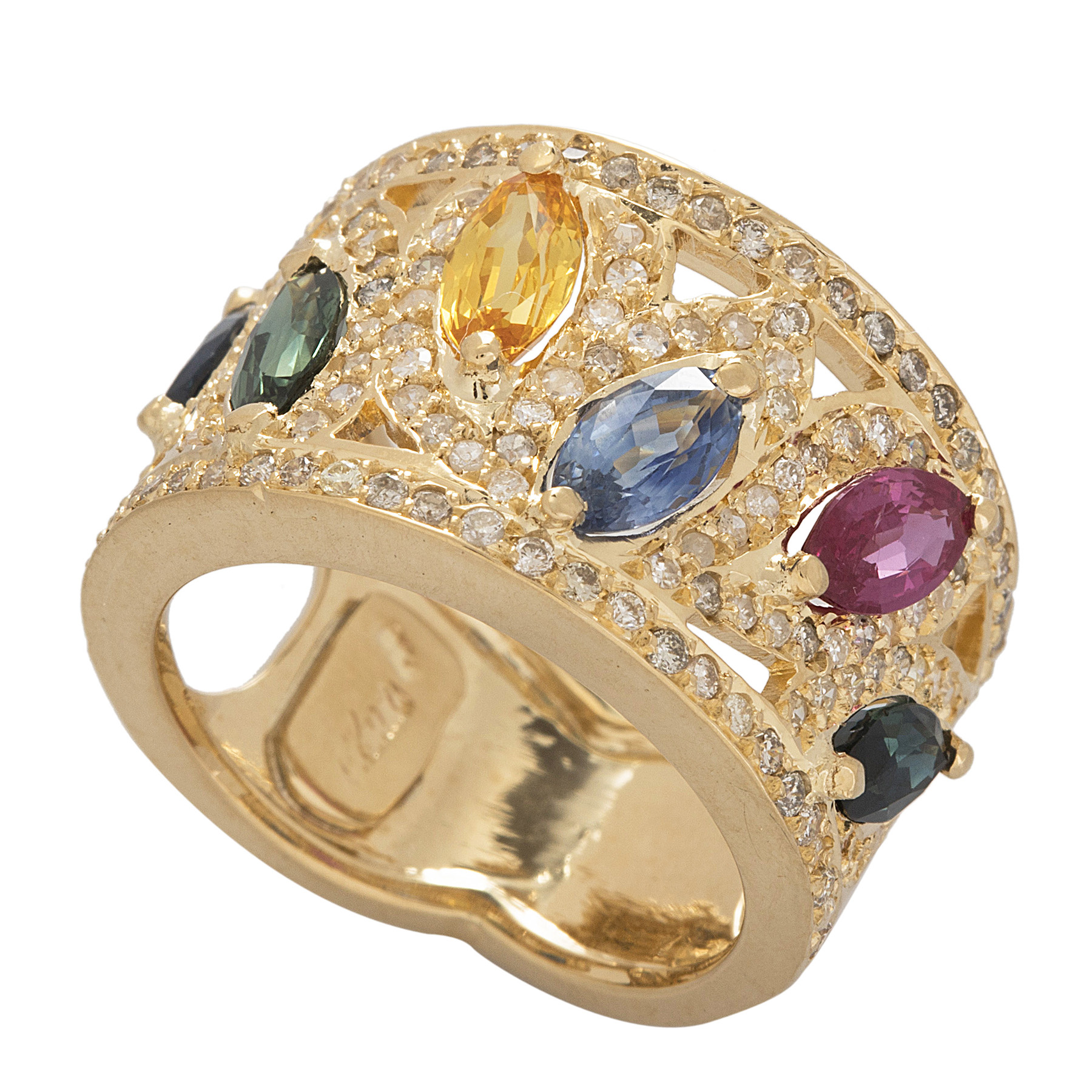 Anel de ouro amarelo com turmalina verde, safiras rosa e azul, citrino e 11,7g. Medida 20.