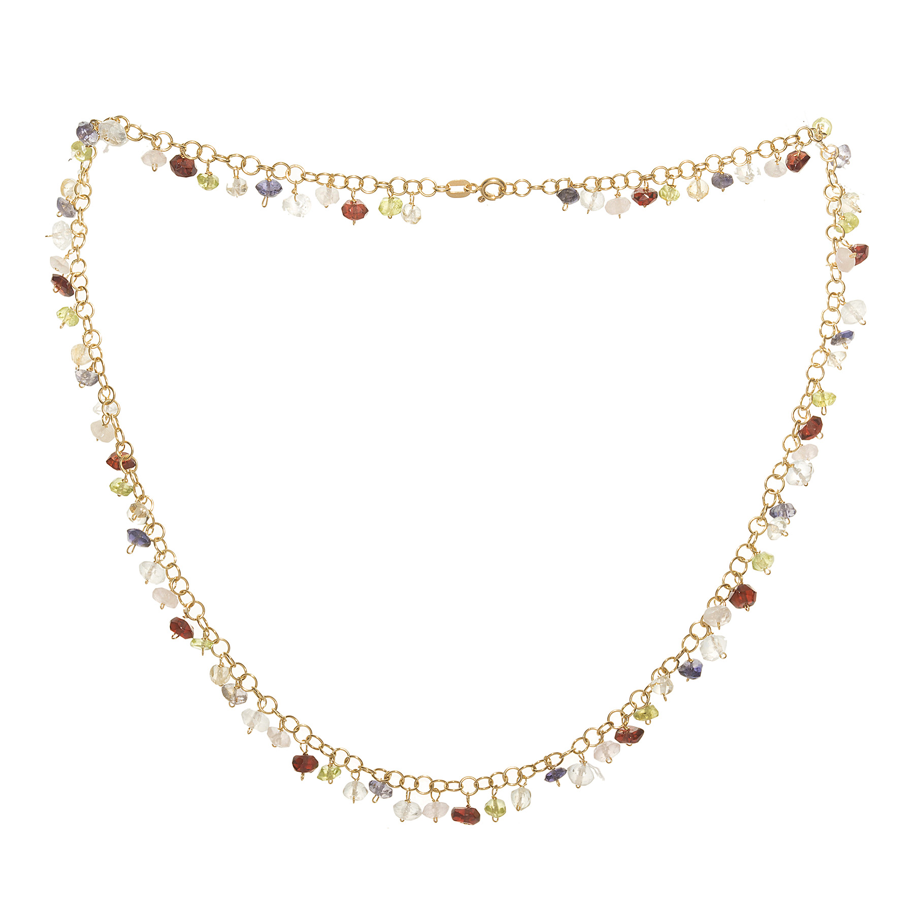 Gargantilha de ouro amarelo, iolitas, granadas, peridotos, quartzos e 11,6g. Medida 40cm.