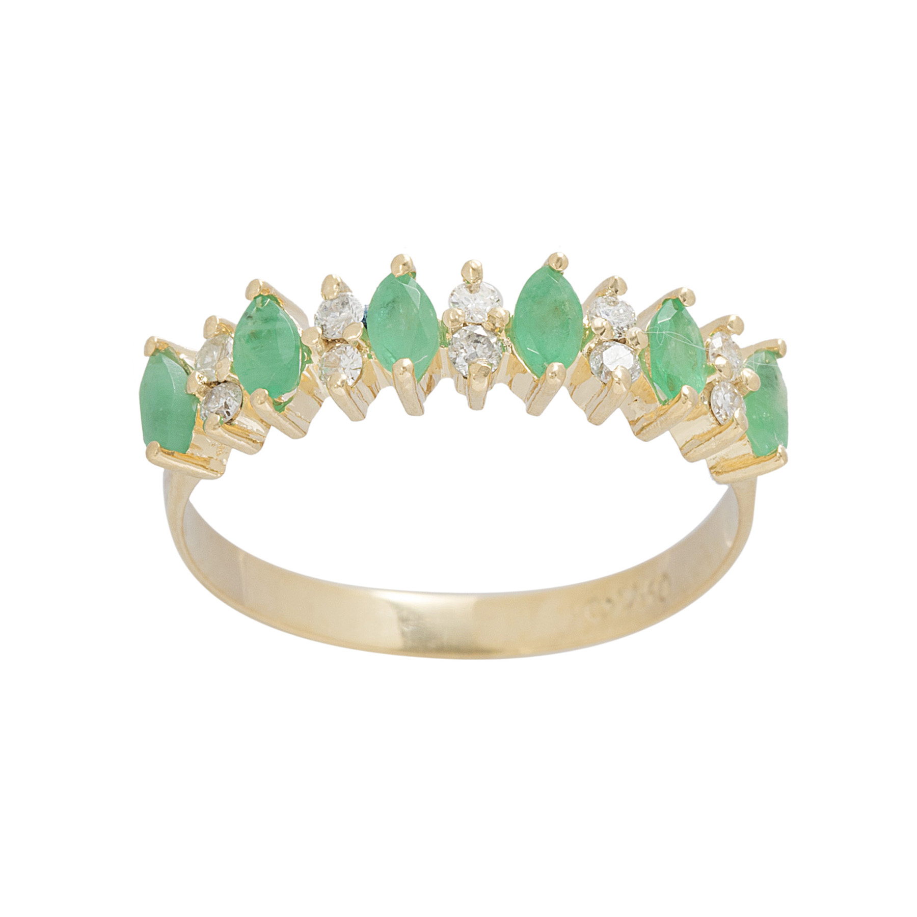 Meia-aliança de ouro amarelo com 0,48ct de esmeraldas, 0,20ct de brilhantes e 2,4g. Medida 19.