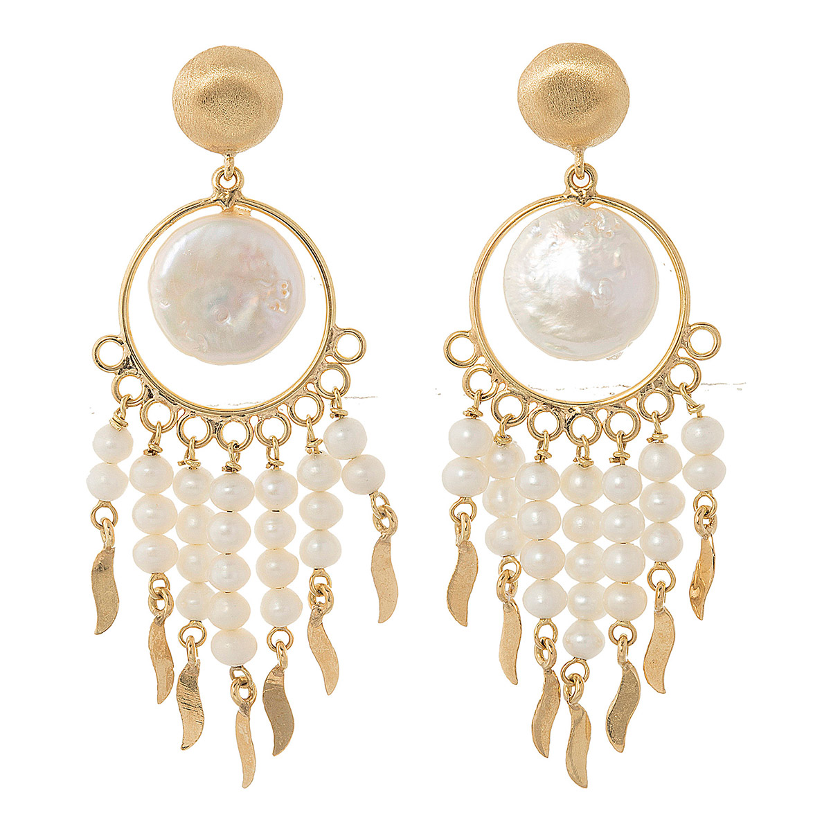 Brinco de ouro amarelo com pérolas (3,5mm), madrepérolas e 10,5g. Medida 6cm.