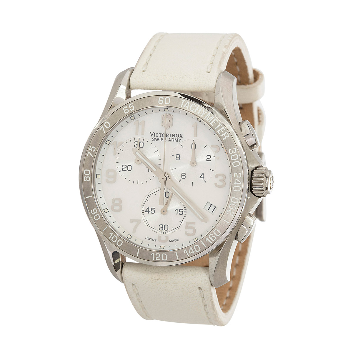 Relógio VICTORINOX com caixa de aço e pulseira de couro, movimento a quartz, fundo de madrepérola, vidro de safira. Medida da caixa 42mm. Medida da pulseira 23cm.