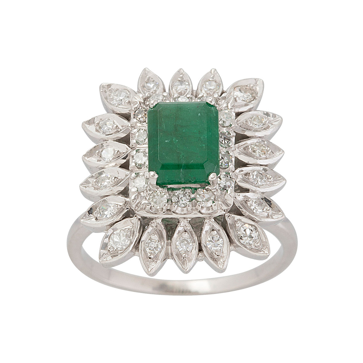 Anel de ouro branco com 1,36ct de esmeralda, 0,50ct de brilhantes e 6,3g. Medida 16.