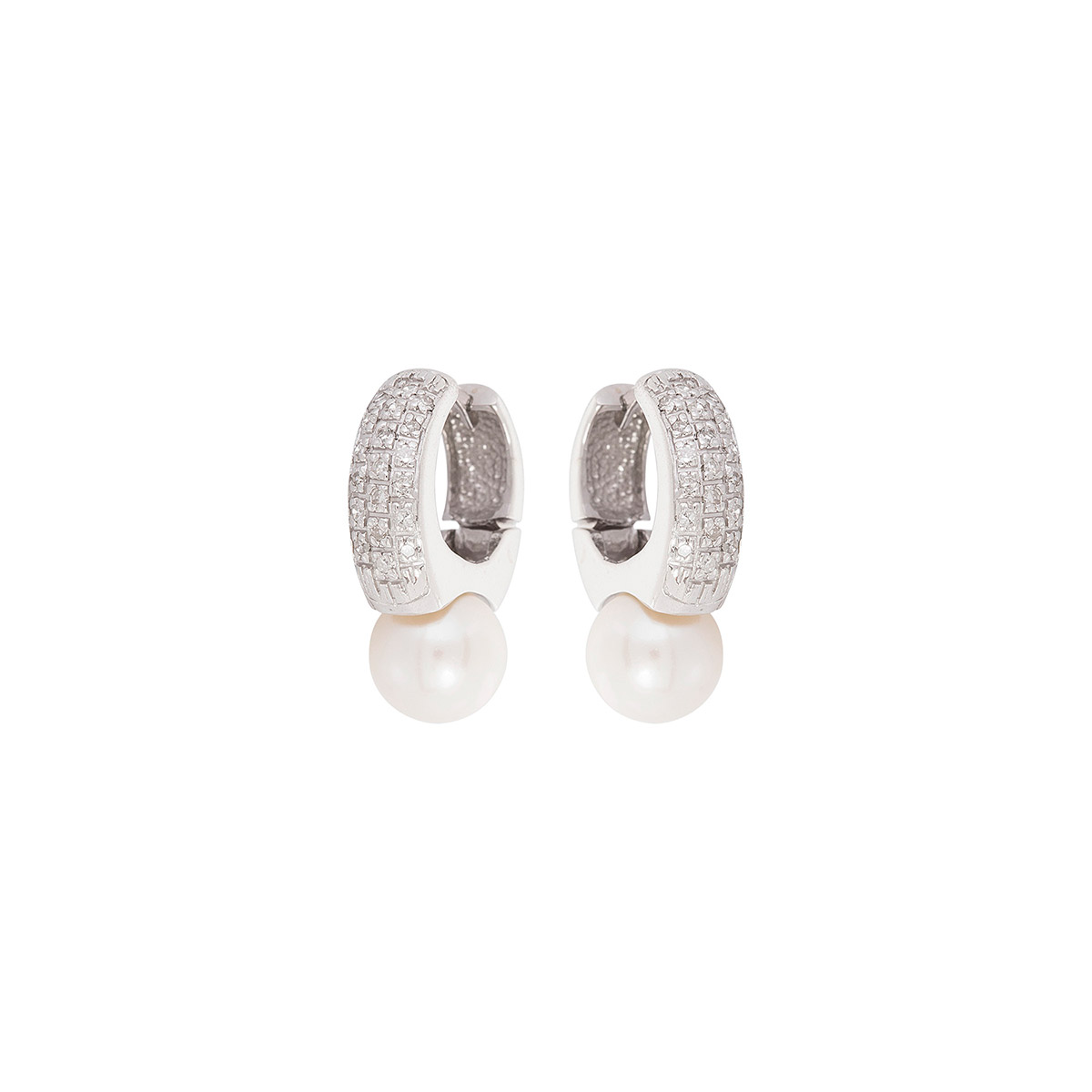 Brinco de ouro branco com pérolas (8mm), 0,20ct de brilhantes e 7,7g. Medida 2cm.