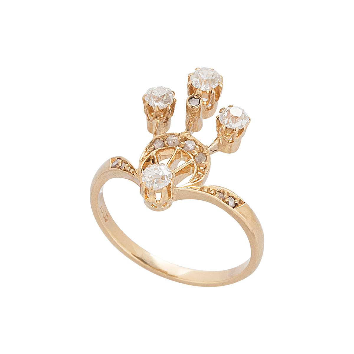 Anel de ouro amarelo com 0,45ct de diamantes (0,05ct de lapidação rose cut/0,40ct de lapidação Brasil) e 2,8g. Medida 14.
