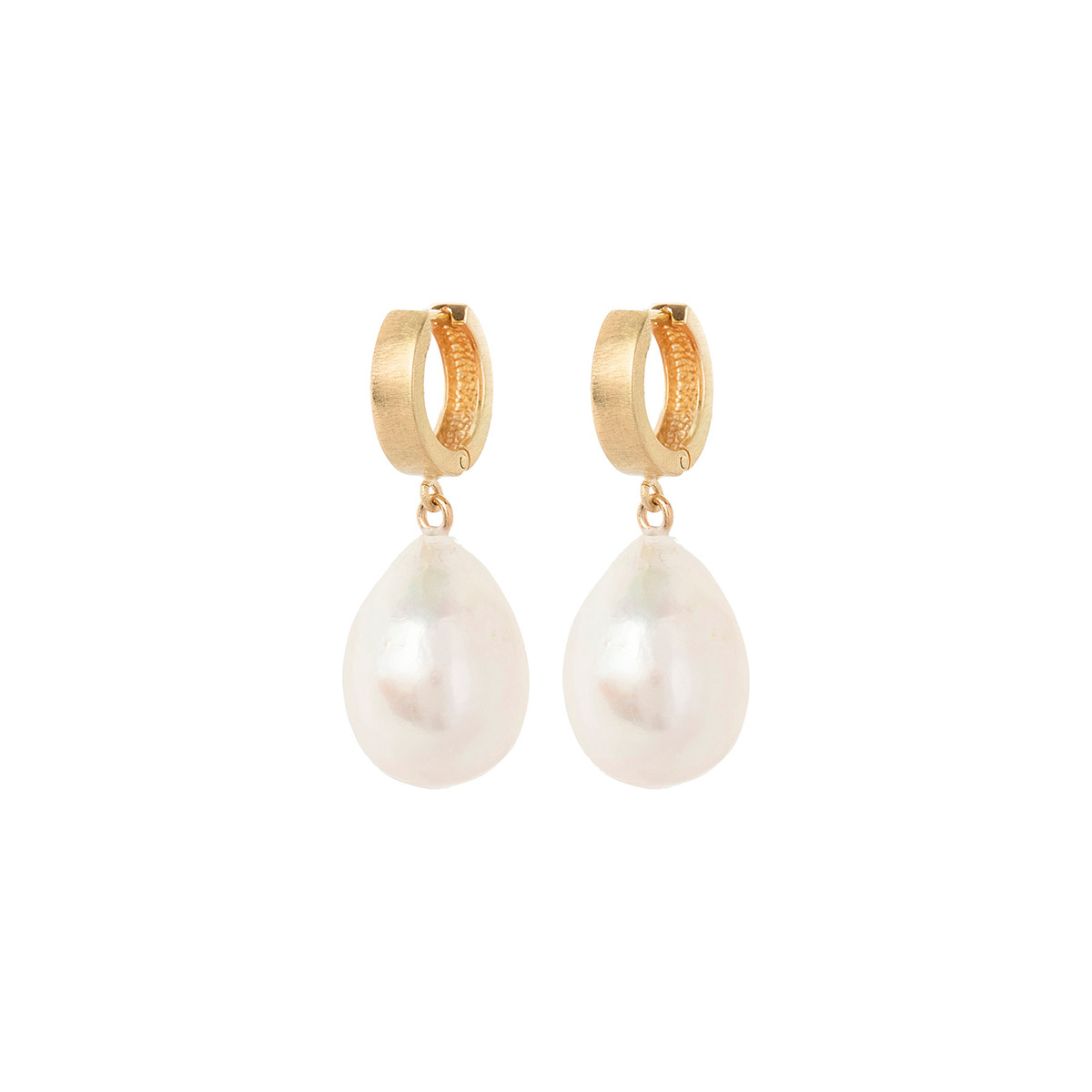Brinco de ouro amarelo com pérolas (12mm) e 8,9g. Medida 3cm.