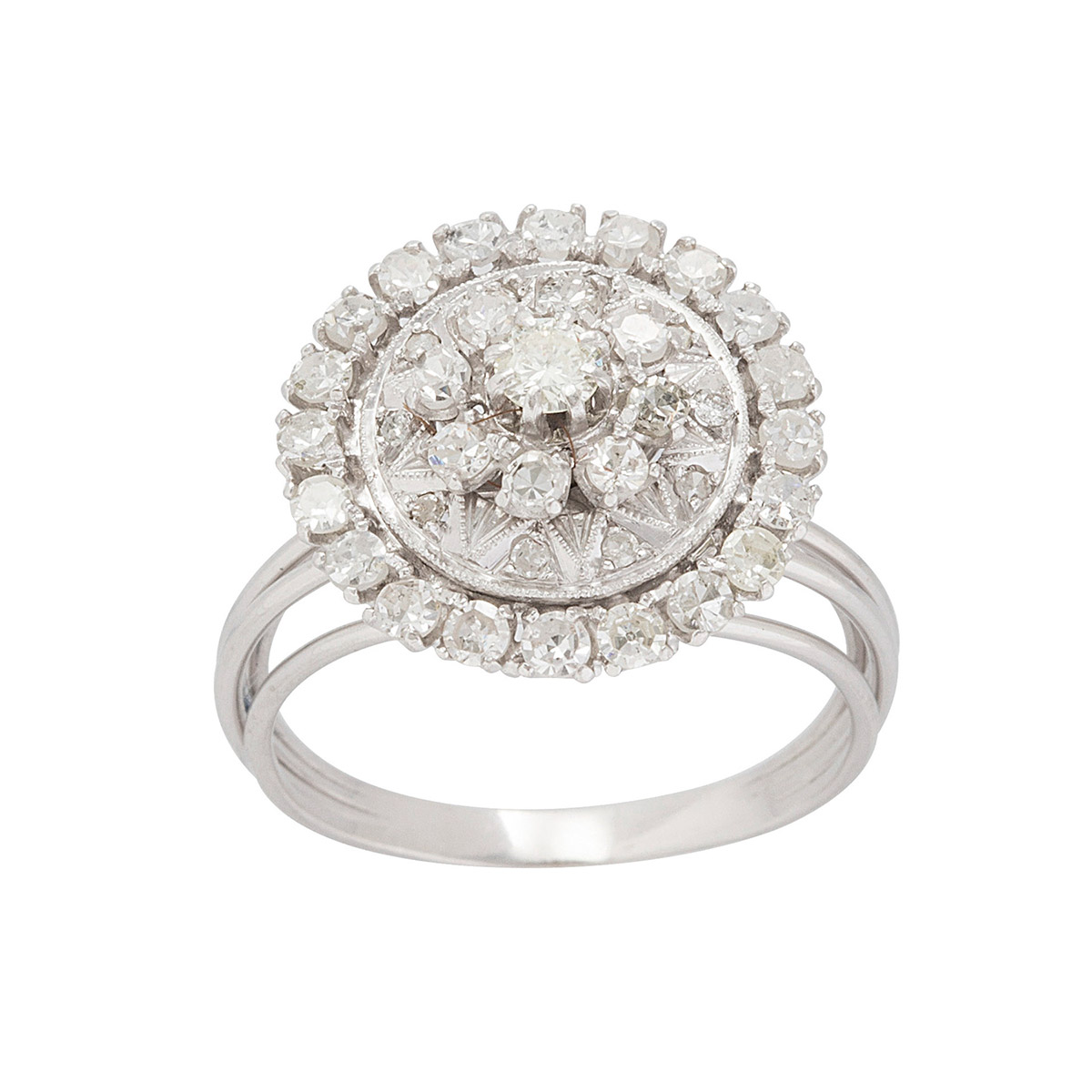 Anel chuveiro de platina com 1,20ct de brilhantes e 5,9g. Medida 17.