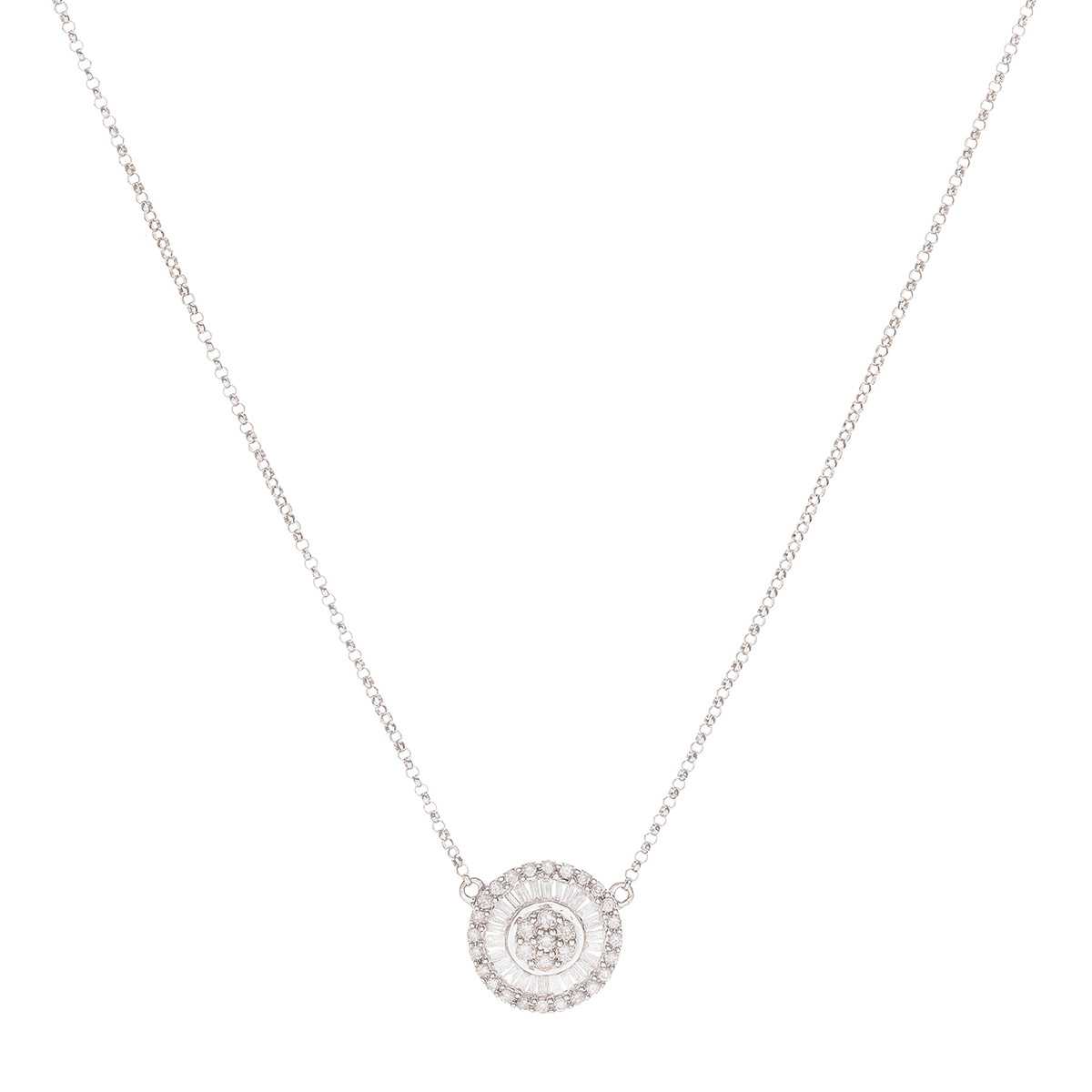 Corrente com pingente de ouro branco, 0,70ct de diamantes (sendo 0,35ct de lapidação brilhante/0,35ct de lapidação trapézio) e 3,8g. Medida da corrente 45cm. Medida do pingente 1,2cm.