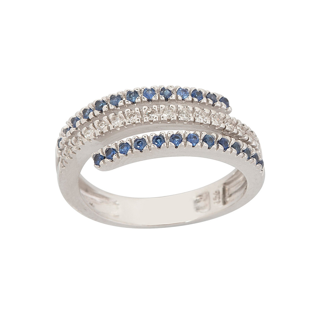 Anel de ouro branco com safiras, 0,20ct de brilhantes e 4,2g. Medida 16.