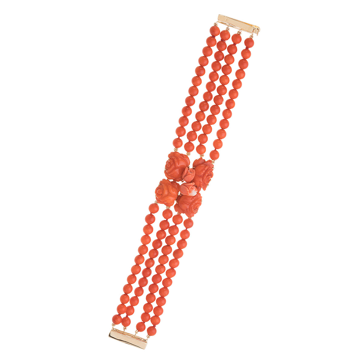 Pulseira de ouro amarelo com corais e 47,1g no total. Medida 18,5cm.