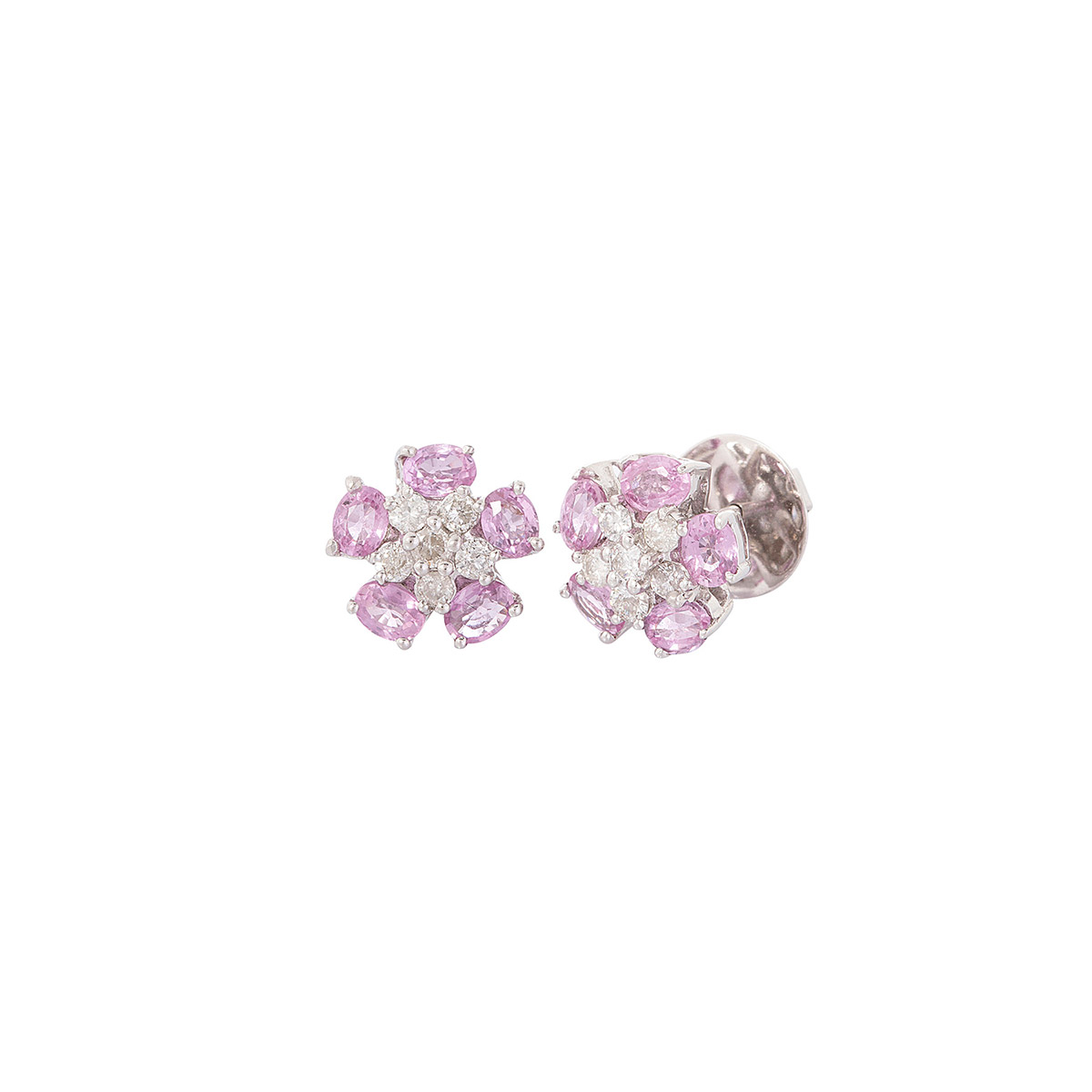 Brinco de ouro branco com safiras rosa, 0,50ct de brilhantes e 4,7g. Medida 1cm.