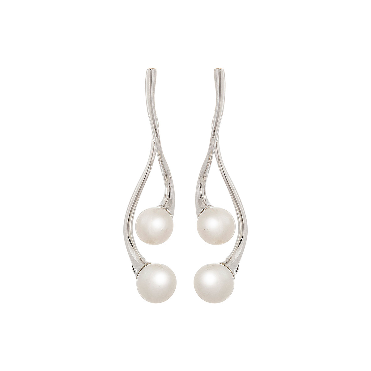 Brinco de ouro branco com pérolas (8,2mm) e 10,8g. Medida 5cm.