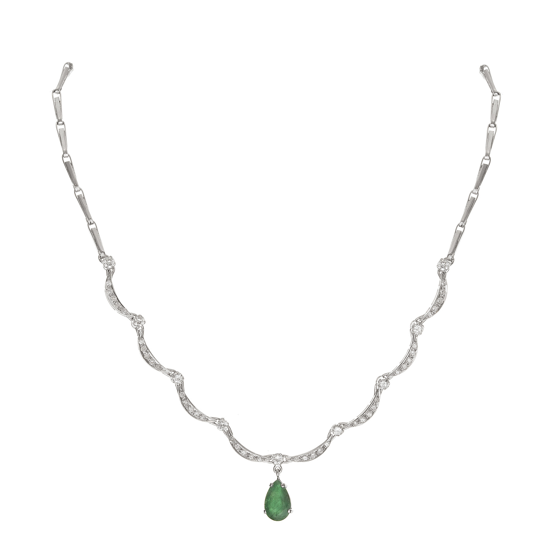 Gargantilha de ouro branco 14k com 2,86ct de esmeralda, 1,80ct de brilhantes e 17,7g. Medida da gargantilha 42cm. Medida do pingente 1,3cm.