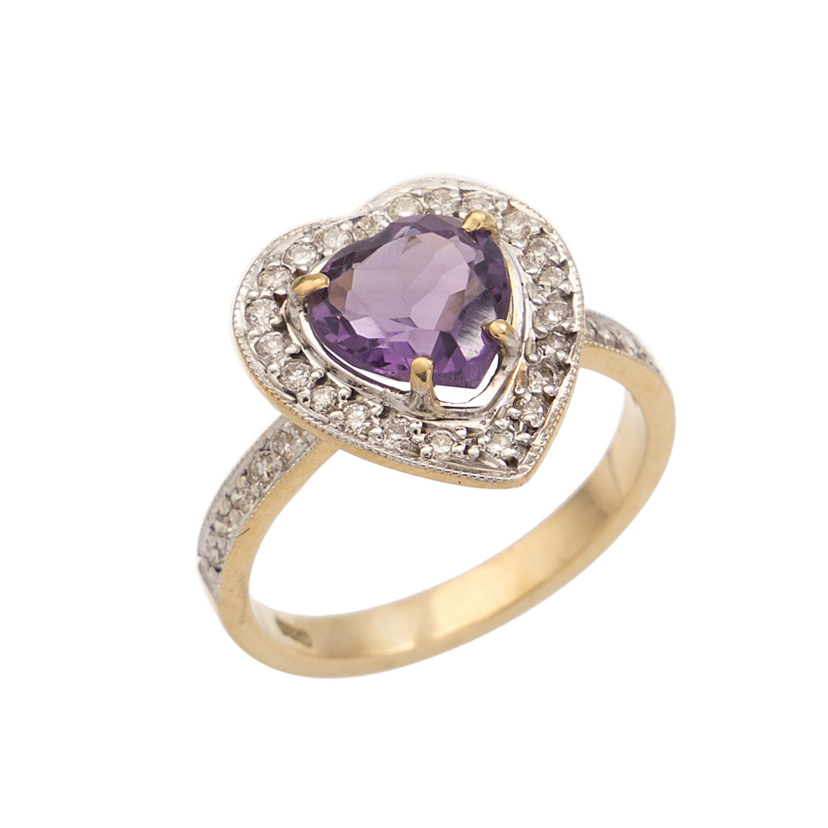 Anel de ouro amarelo e branco com ametista, 0,35ct de brilhantes e 4,7g. Medida 17.