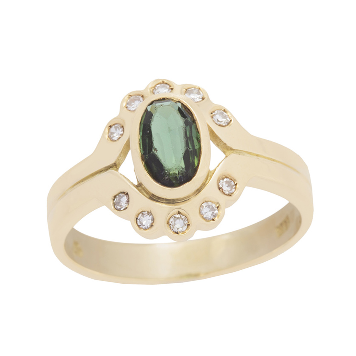 Anel de ouro amarelo com turmalina verde, 0,10ct de brilhantes e 4,4g. Medida 18.