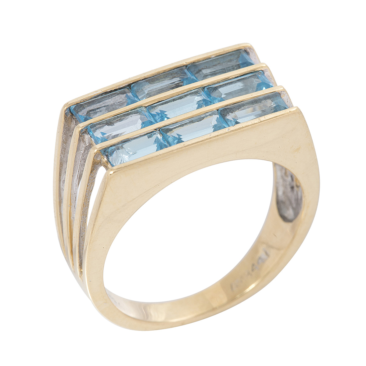 Anel de ouro amarelo com topázios azuis e 6,0g. Medida 17.
