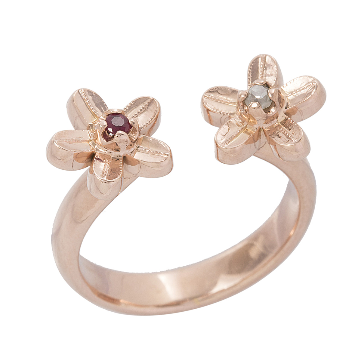Anel de ouro rosé 14k com rubi, 0,05ct de brilhante e 6,6g. Medida 16.
