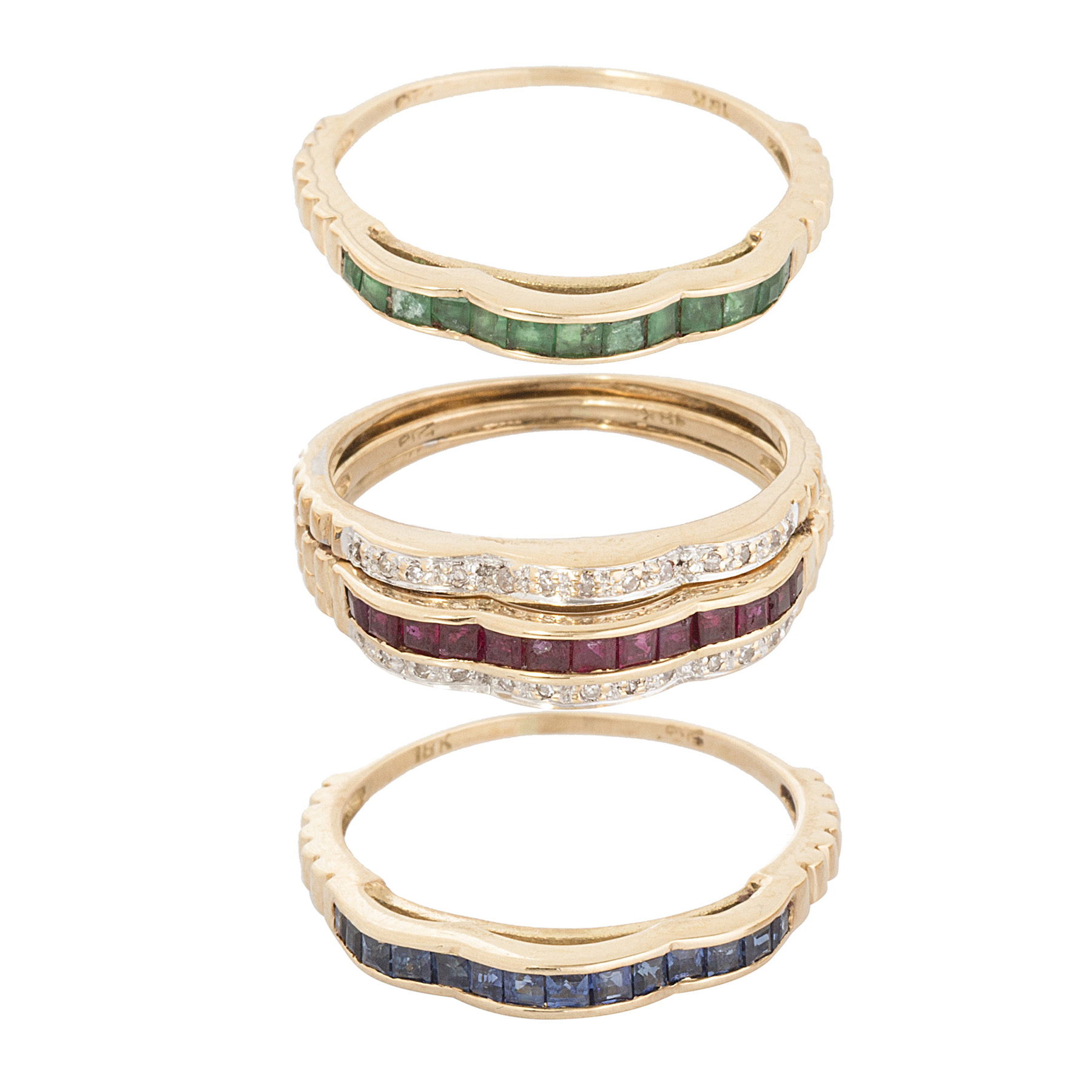 Anel de ouro amarelo com safiras, rubis, esmeraldas, 0,10ct de brilhantes e 8,8g. Medida 16.