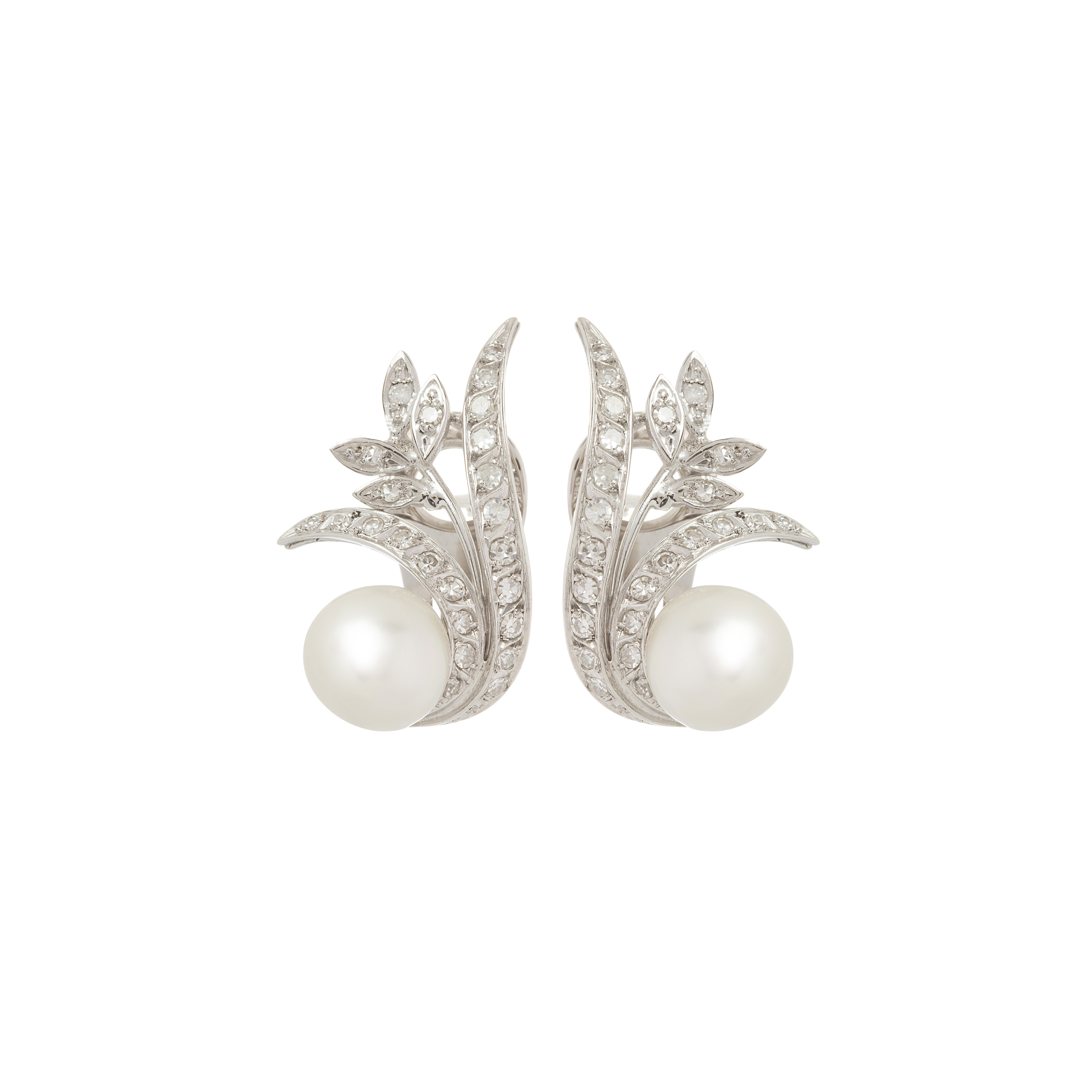 Brinco de platina com pérolas (8mm), 0,50ct de brilhantes e 10,9g. Medida 2,5cm.
