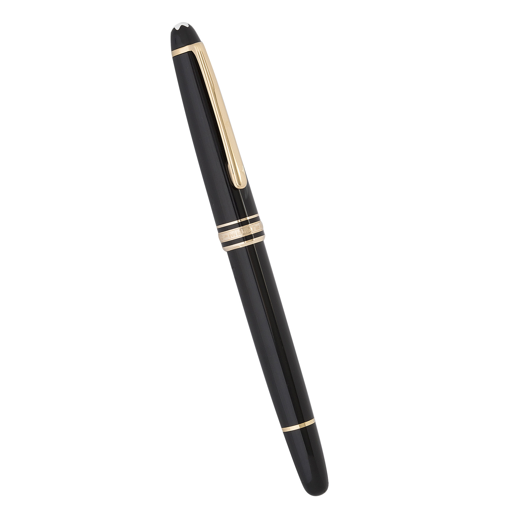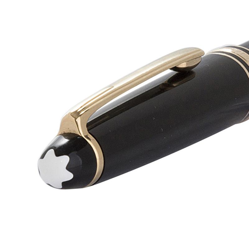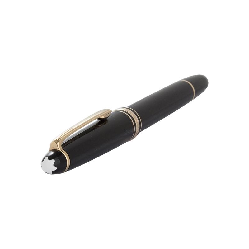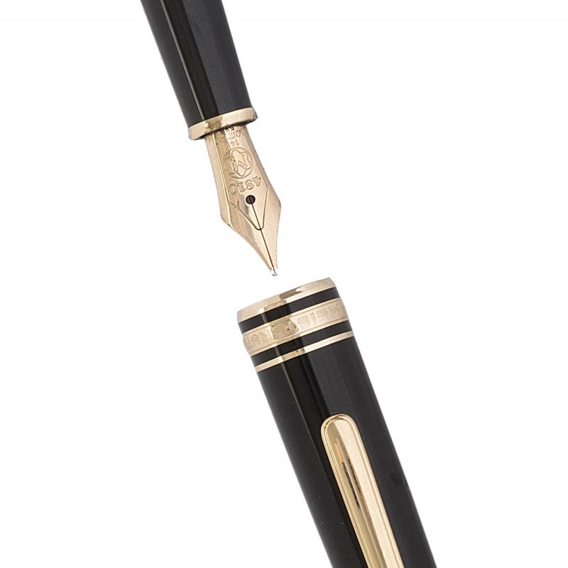 Caneta tinteiro Montblan tamanho pequeno com reina preta, detalhes folheados a ouro e pena de ouro 14k. Medida 13,5cm.