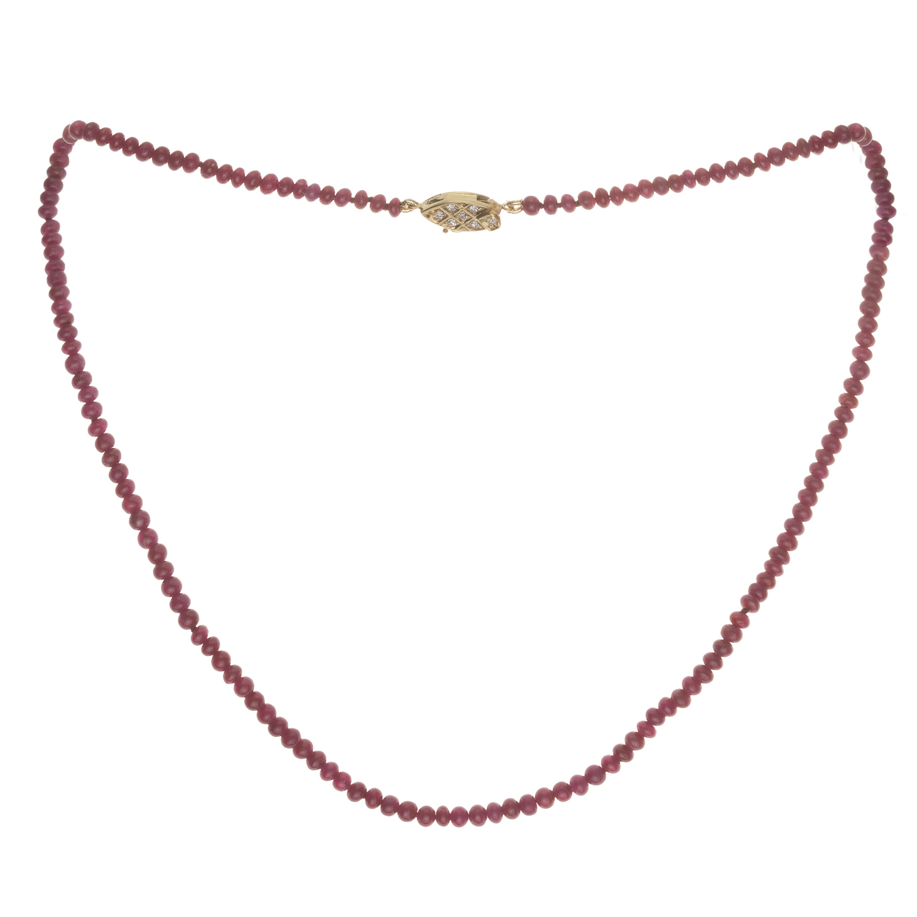 Colar de rubis (3,2mm) com fecho de ouro amarelo, 0,15ct de brilhantes e 10,7g no total. Medida 38,5cm.