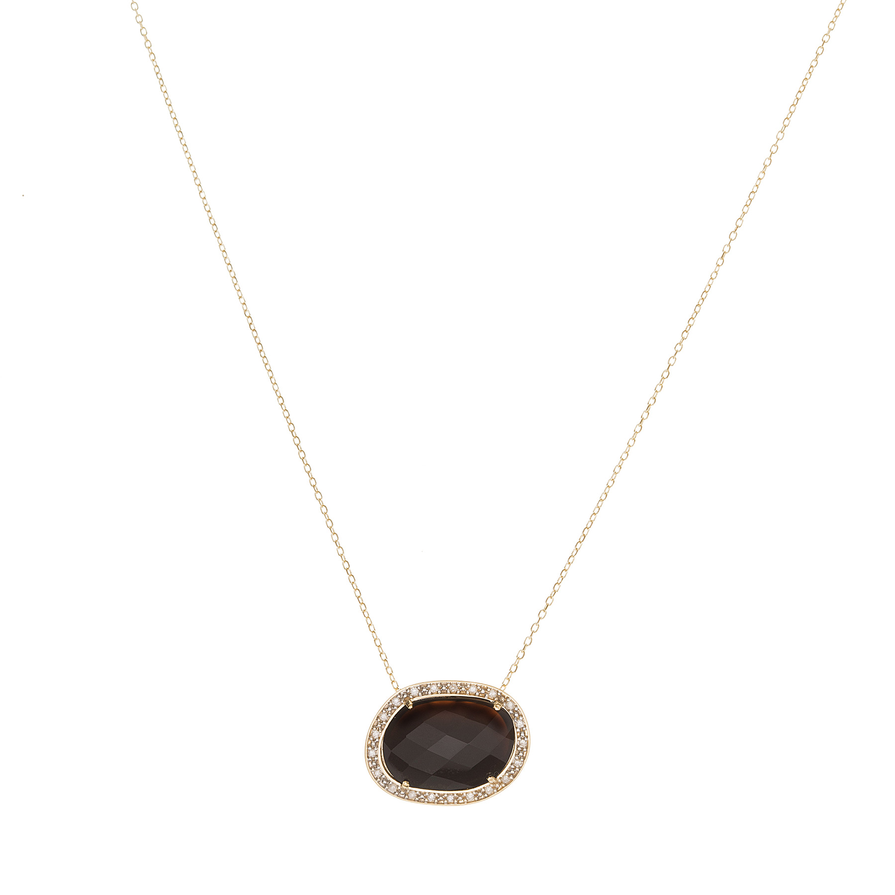 Corrente com pingente de ouro amarelo, 2,90ct de quartzo fumê, 0,10ct de brilhantes e 3,6g. Medida da corrente 45cm. Medida do pingente 1,5x2cm.
