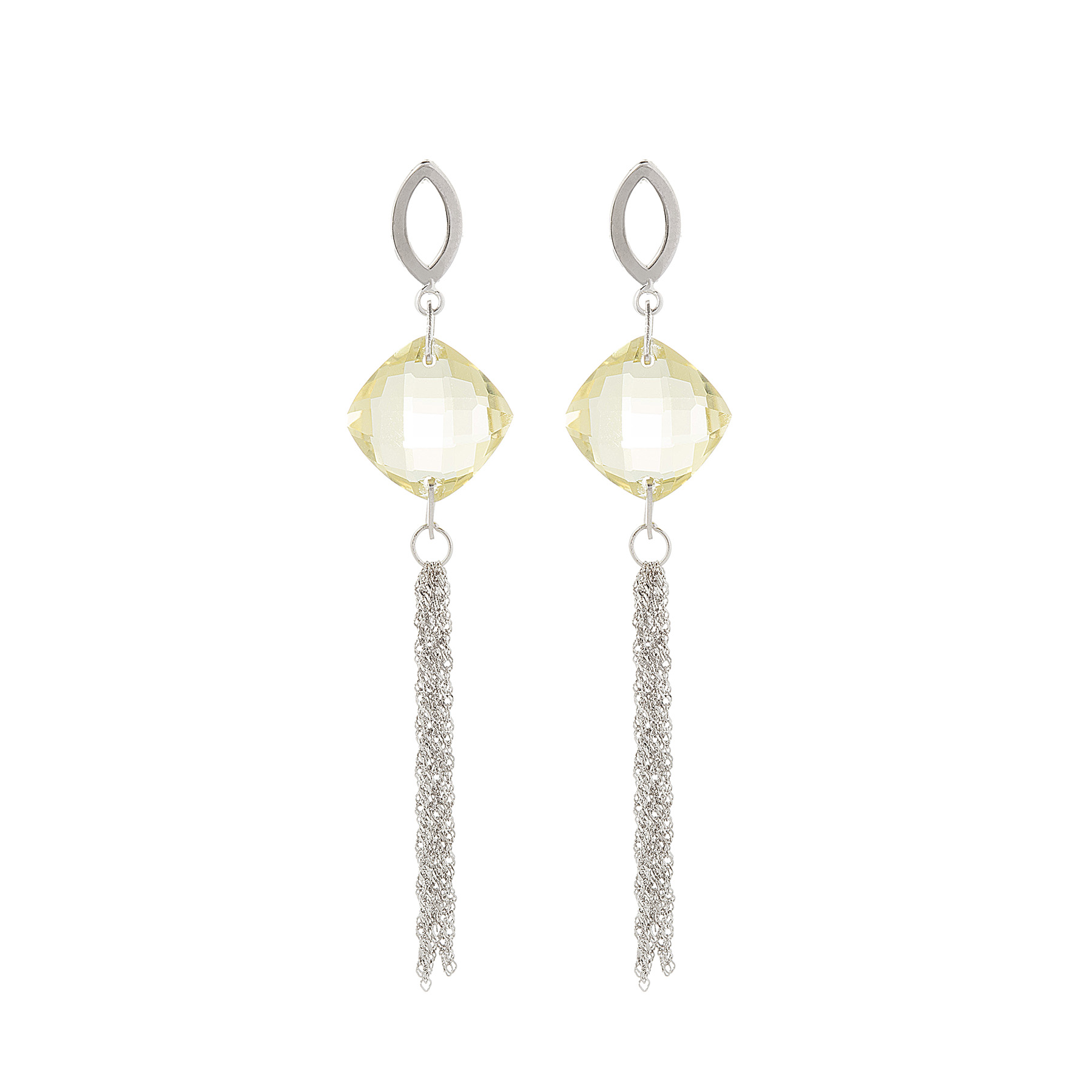 Brinco de ouro branco com peridotos e 2,9g. Medida 5,8cm.