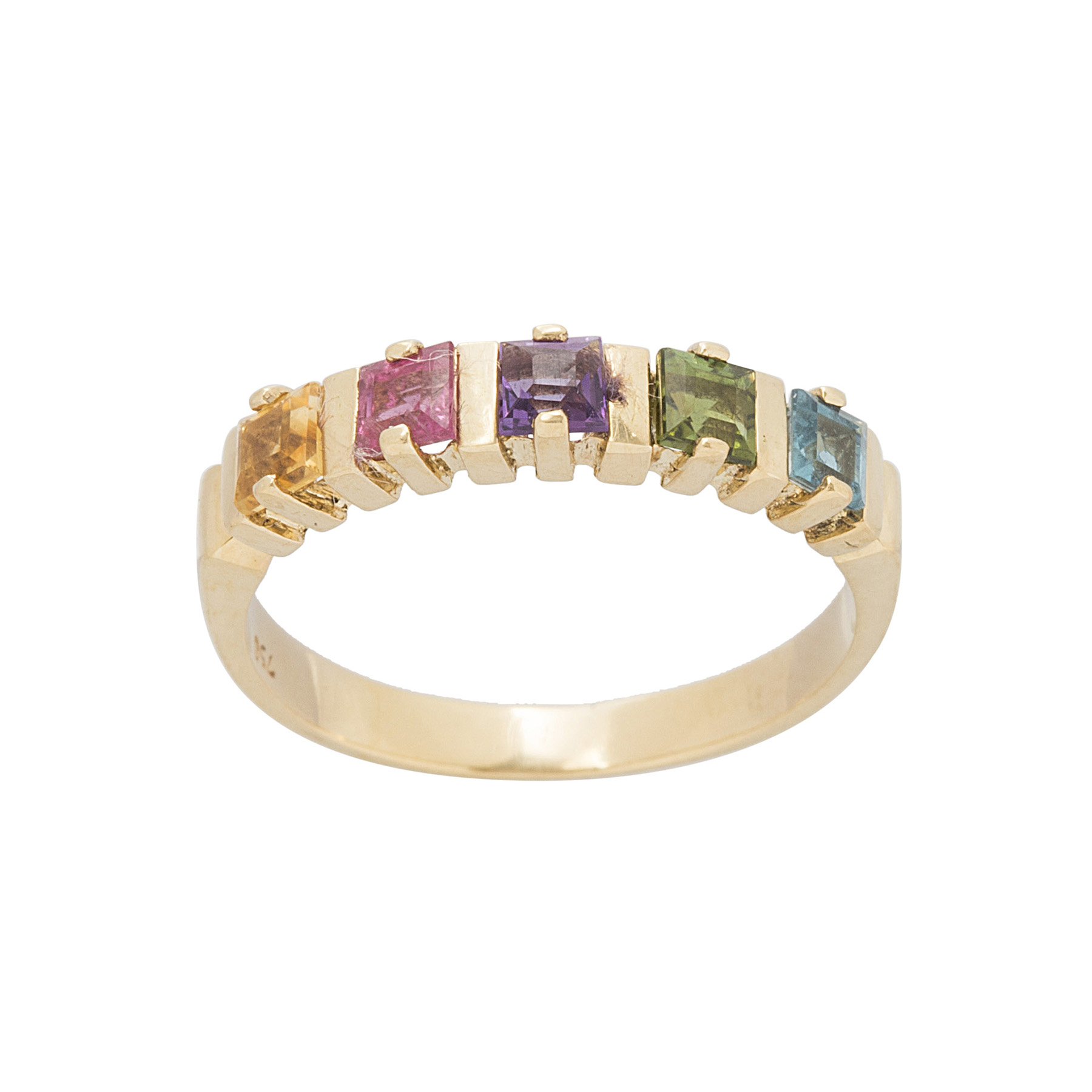 Meia-aliança de ouro amarelo com turmalina rosa e verde, ametista, citrino, topázio azul e 3,1g. Medida 16.