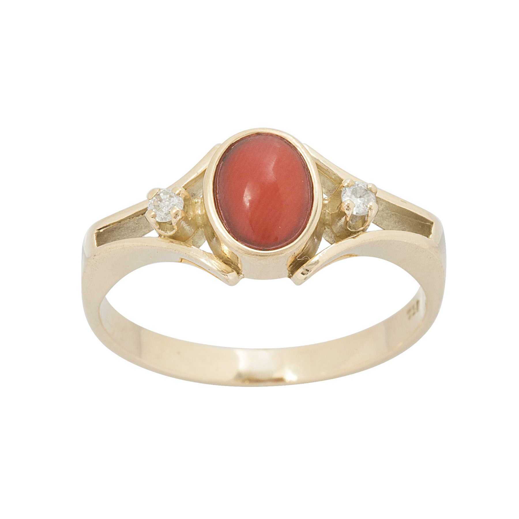 Anel de ouro amarelo com coral, 0,06ct de brilhantes e 2,9g. Medida 16.