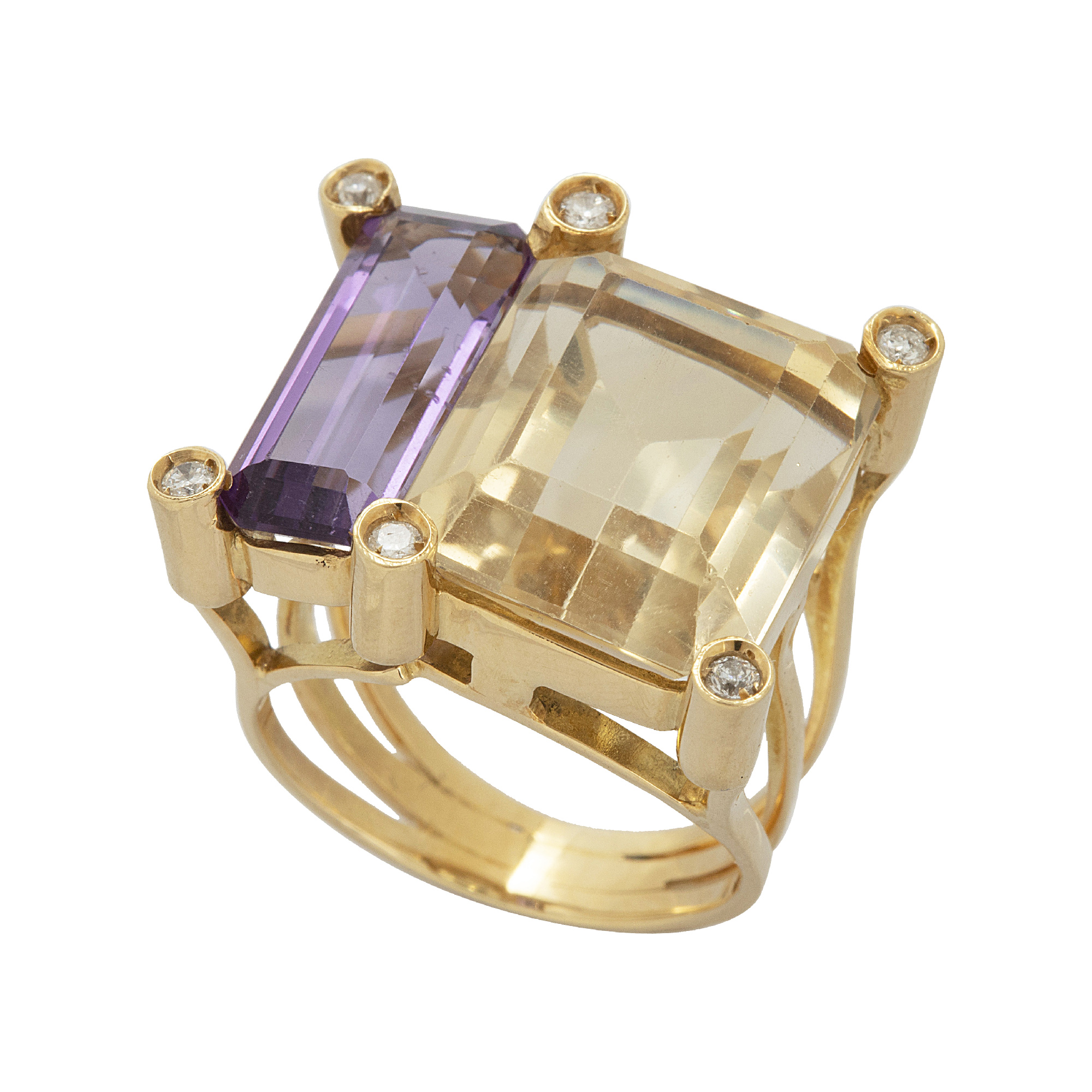 Anel de ouro amarelo com citrino, ametista, 0,15ct de brilhantes e 11,4g. Medida 14.
