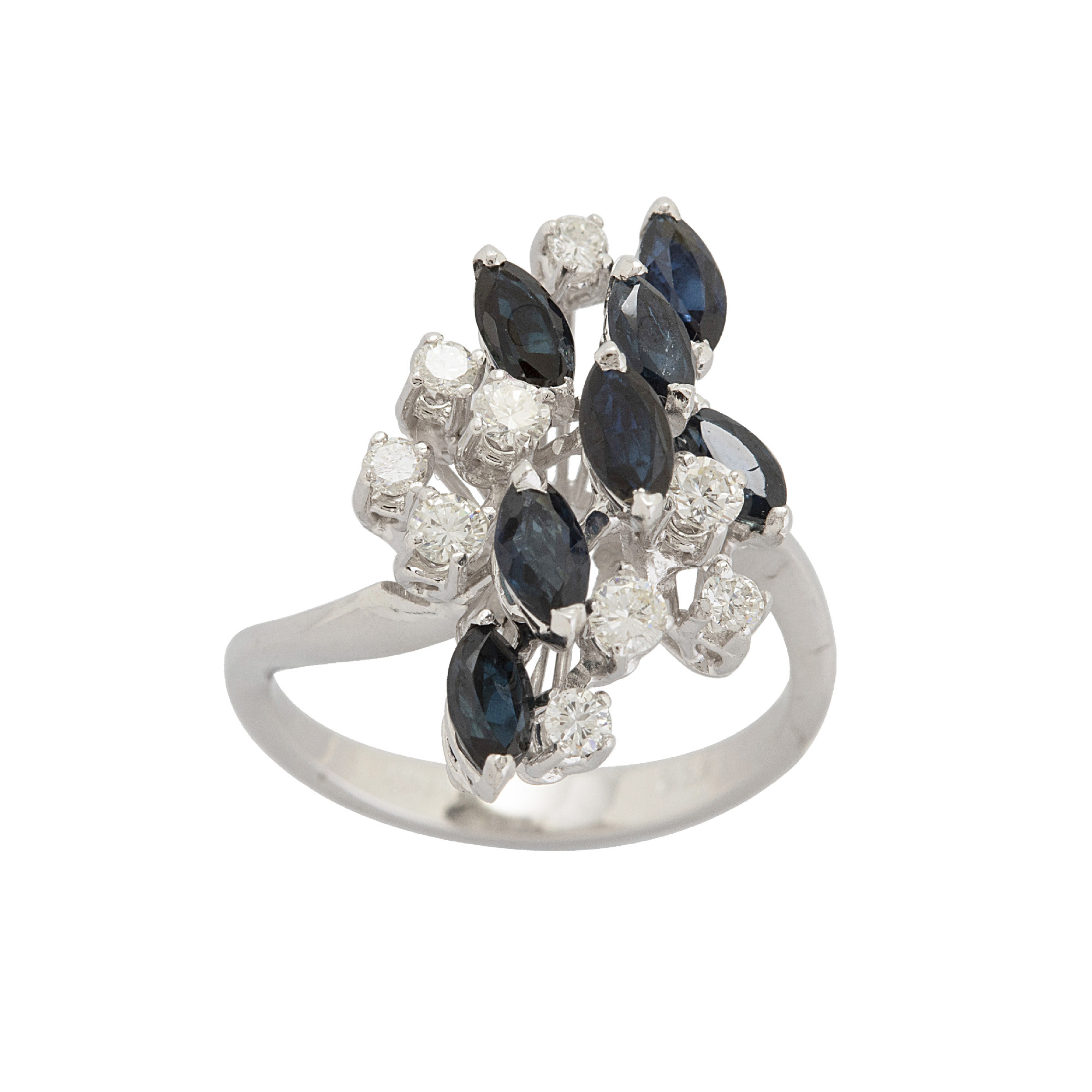 Anel de ouro branco com safiras e 0,45ct de brilhantes. Medida 14.