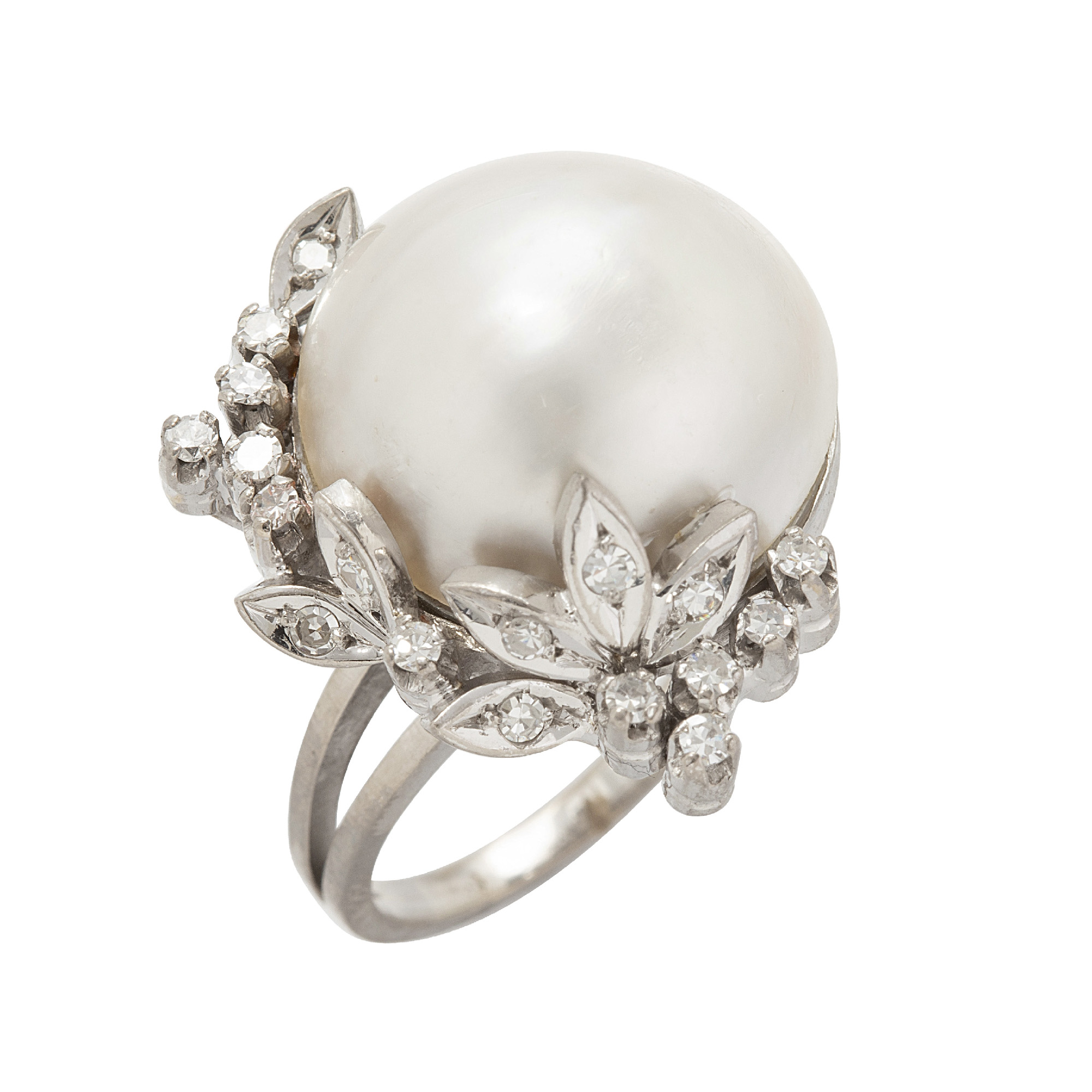 Anel de ouro branco com pérola mabe, 0,45ct de brilhantes e 14,3g. Medida 18.