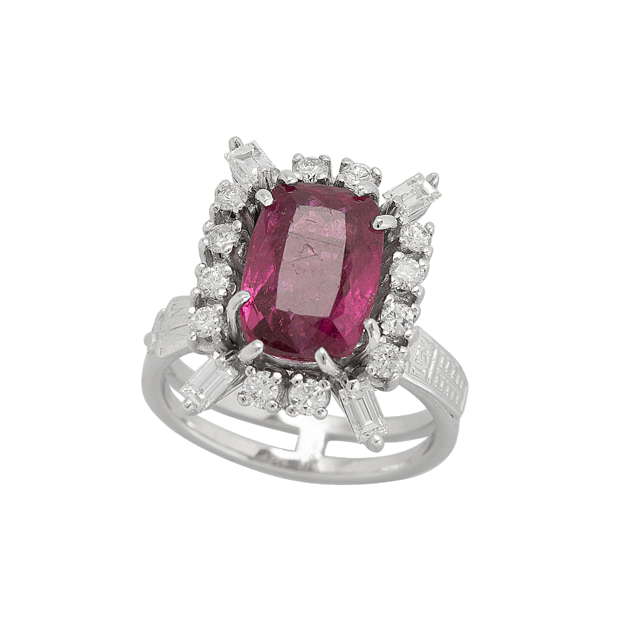 Anel de ouro branco com turmalina rosa, 0,90ct de diamantes (sendo 0,35ct de lapidação de baguete/0,55ct de lapidação brilhante) e 8,3g. Medida 15.