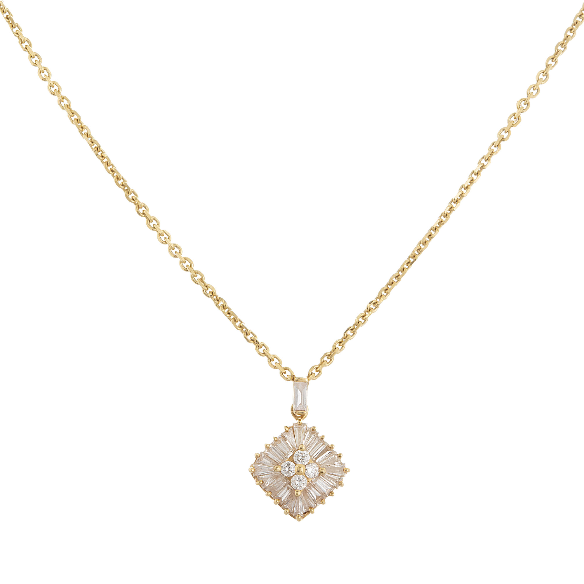 Corrente com pingente de ouro amarelo e 0,65ct de diamantes (sendo 0,10ct de lapidação brilhante/0,55ct de lapidação baguete). Medidas 1,5cm/53cm.