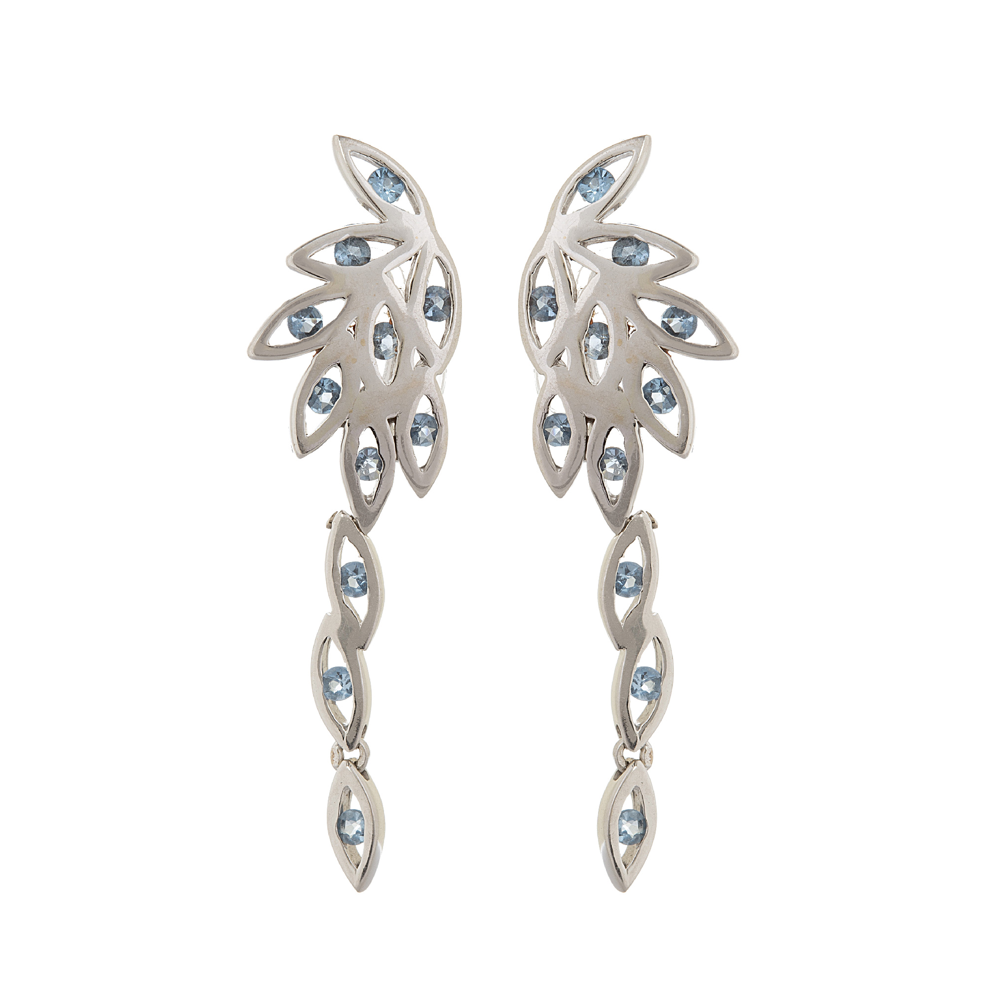 Brinco de ouro branco com topázios azuis e 6,6g. Medida 4cm.