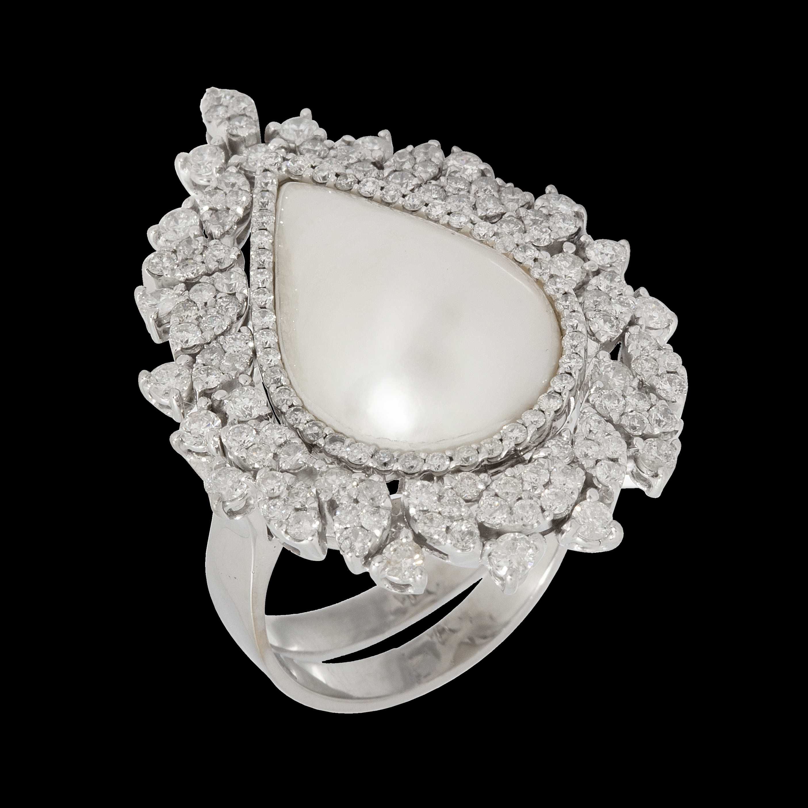 Anel de ouro branco com pérola mabe, 2,00ct de brilhantes e 14,3g. Medida 18.