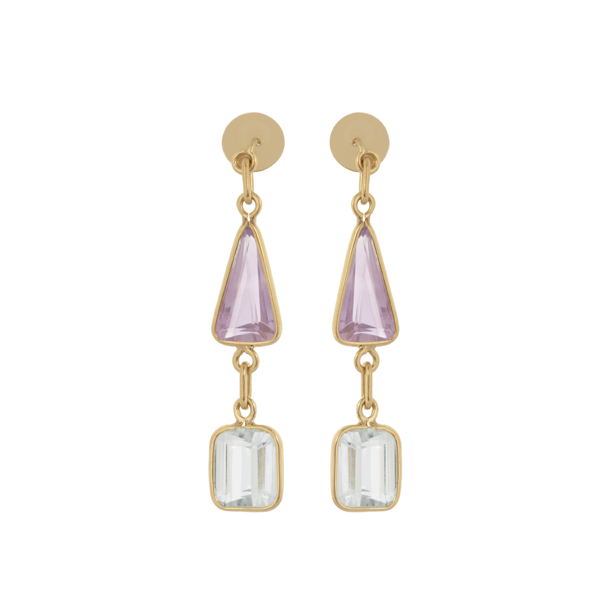 Brinco de ouro amarelo com topázios azuis e ametistas. Medida 4,2cm.