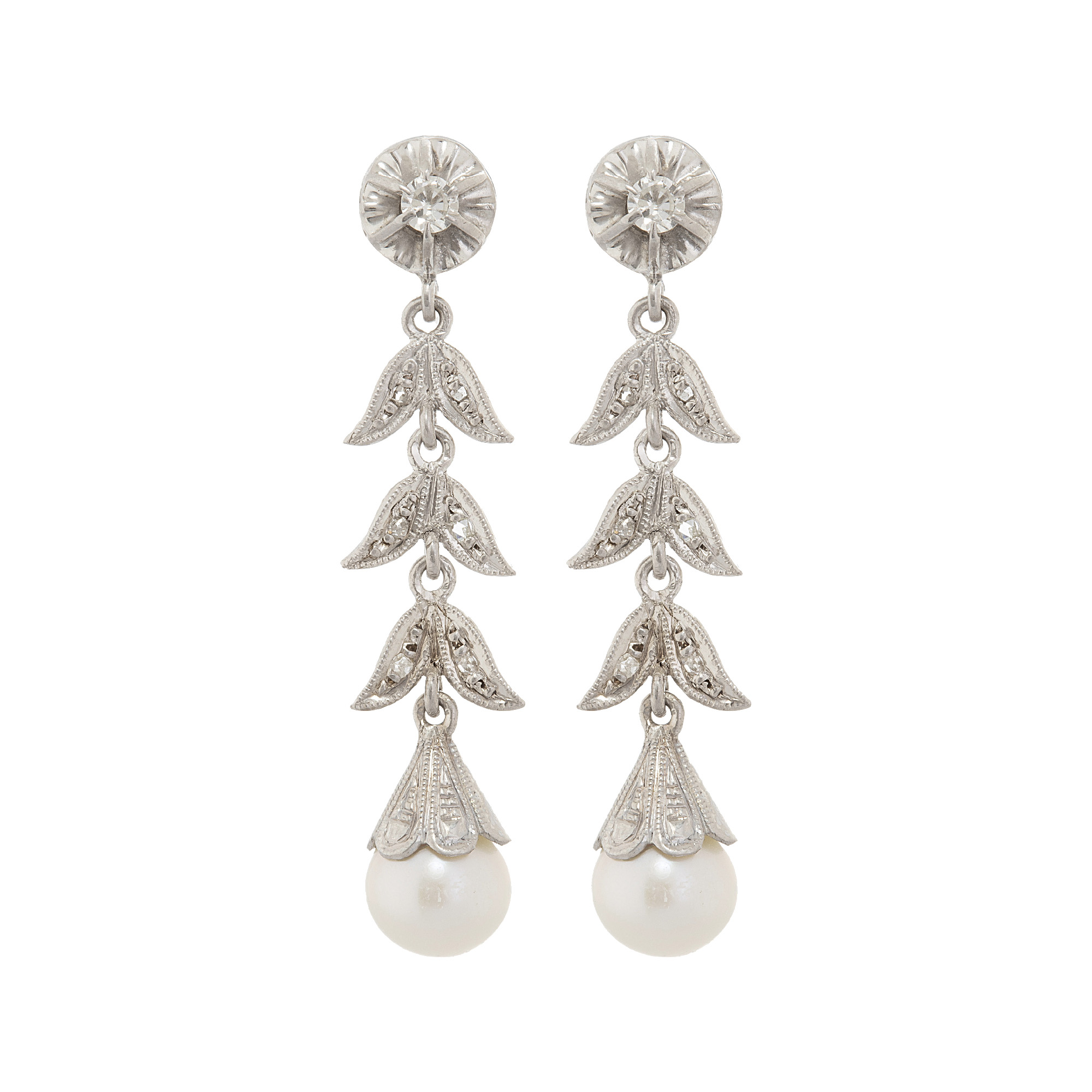 Brinco de ouro branco com pérolas (6,3mm) e 0,20ct de brilhantes. Medida 4,9cm.