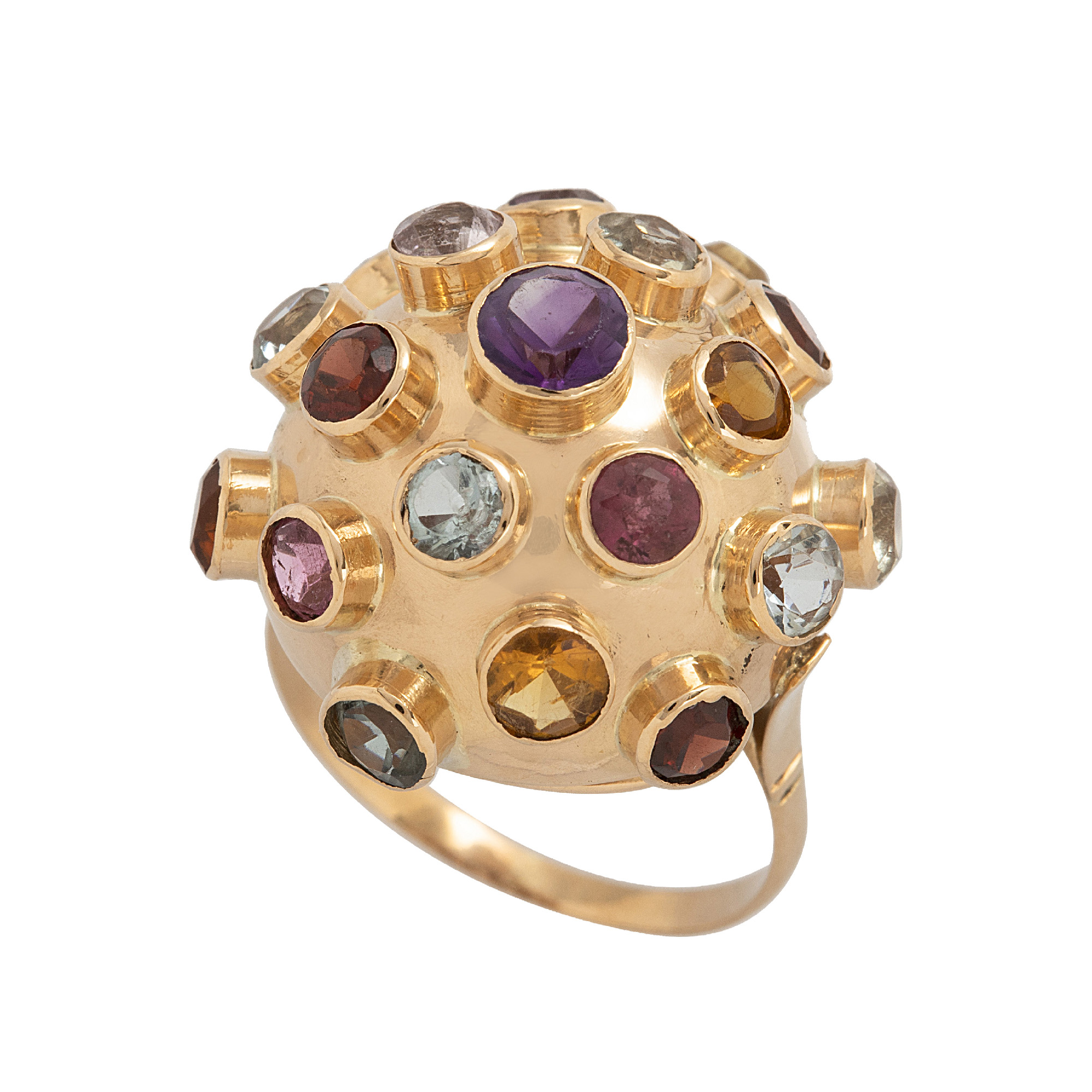 Anel de ouro amarelo com ametistas, granadas, topázios azuis, turmalinas rosa, citrinos e praziolitas. Medida 16.