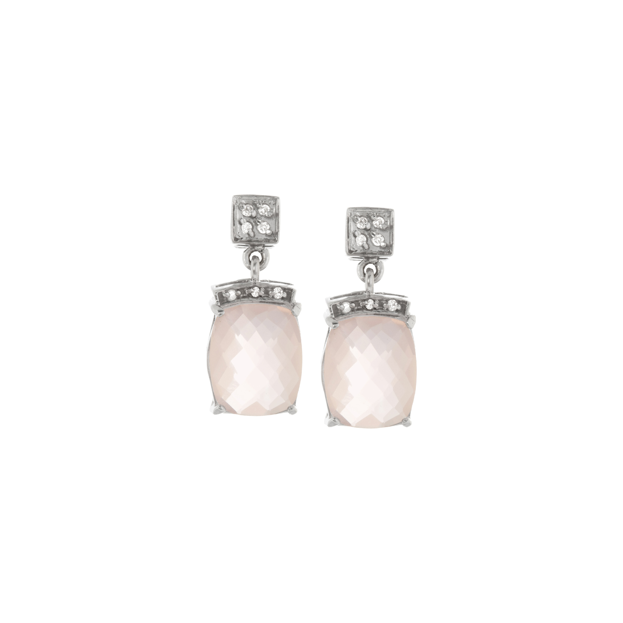 Brinco de ouro branco com quartzos rosa e 0,05ct de brilhantes. Medida 2cm.
